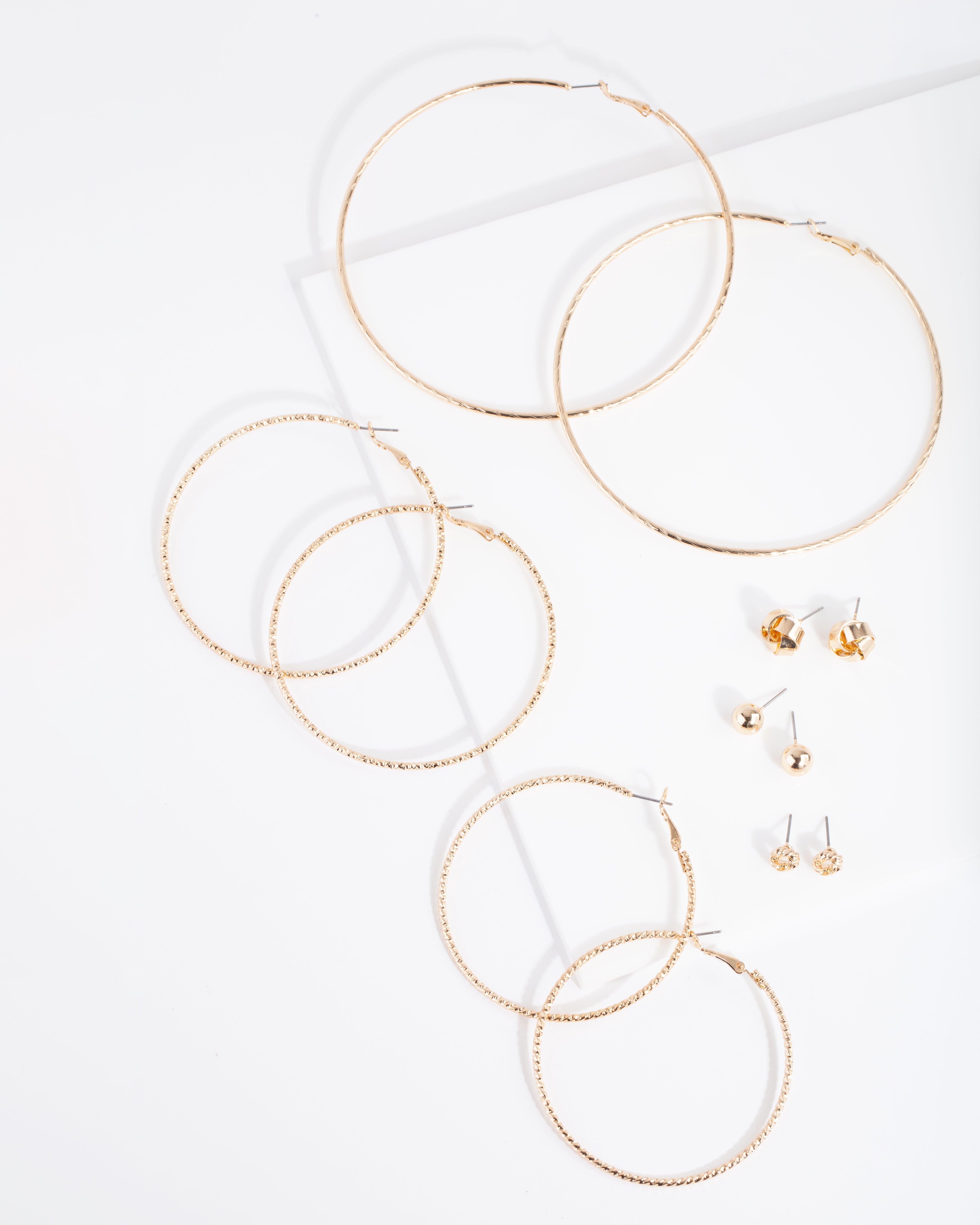 This gold tone earring pack boasts three textured hoops in various sizes and a variety of ball and knot studs. An everyday staple to add to your collection. Wear alone, or layer up you lobe!