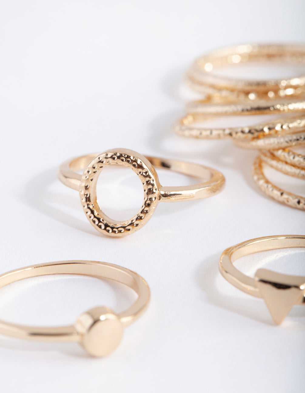 Mix and match with our ring packs! Stackable rings allow you to create your own personalised looks. This pack comes with a variety of gold-toned styles featuring stunning diacut band designs.