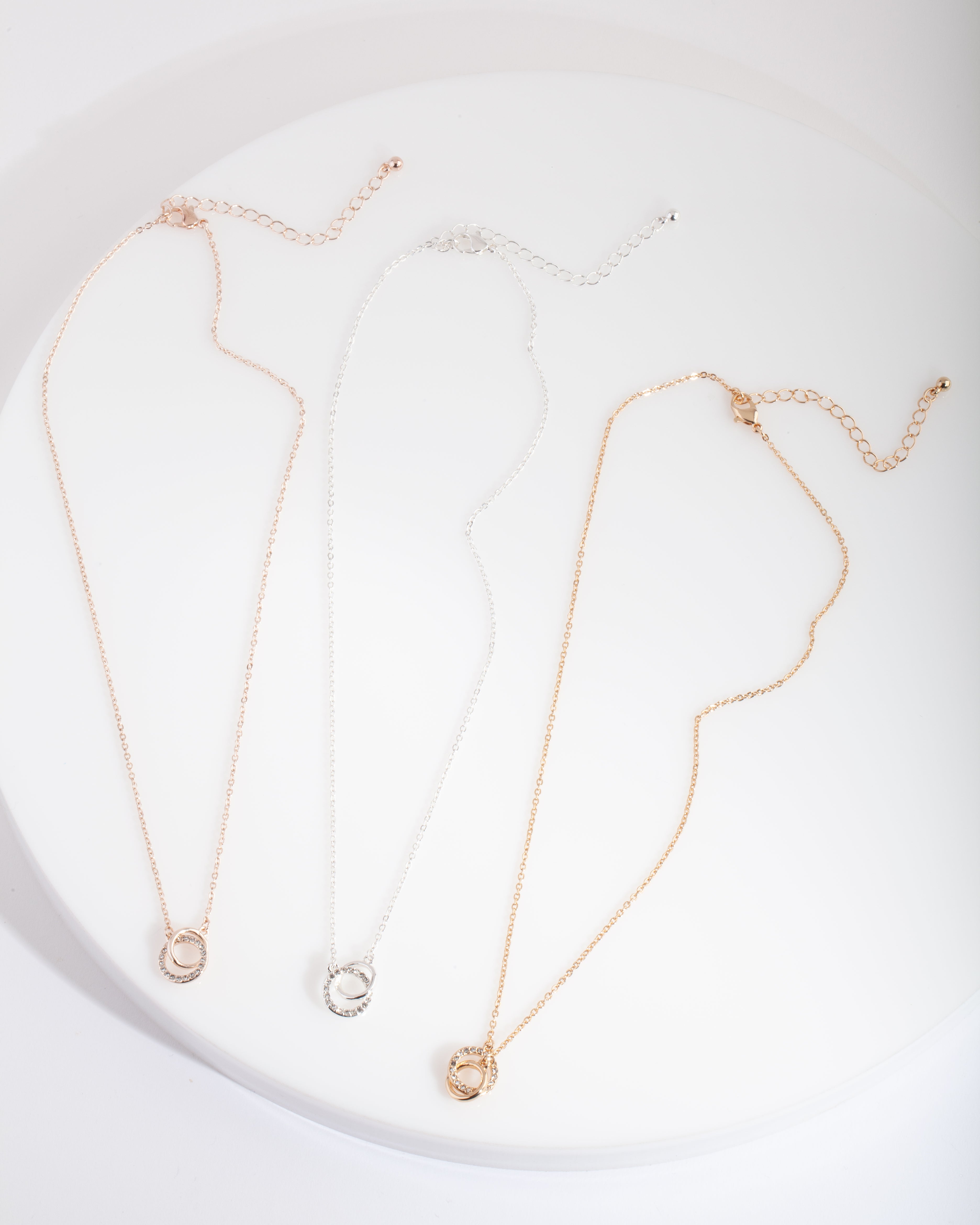 Layer it up with finer chains or wear alone for a considered look. Nearly every outfit can be elevated with neckwear. This necklace trio features a mixed metal circle diamante design.