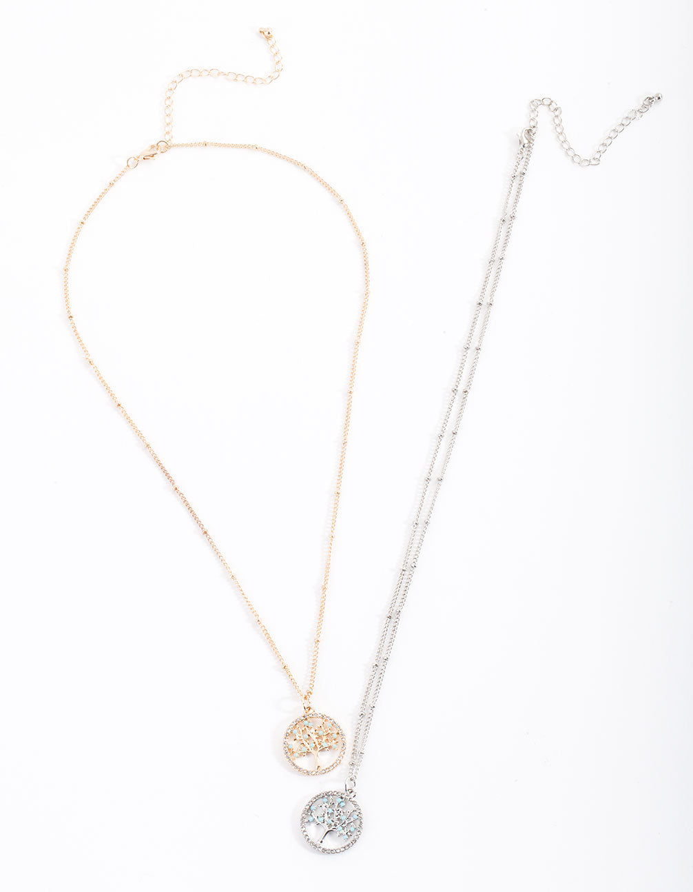 This set comprises of two mixed metal necklaces with diamante encircled tree pendants and are perfect for gifting.