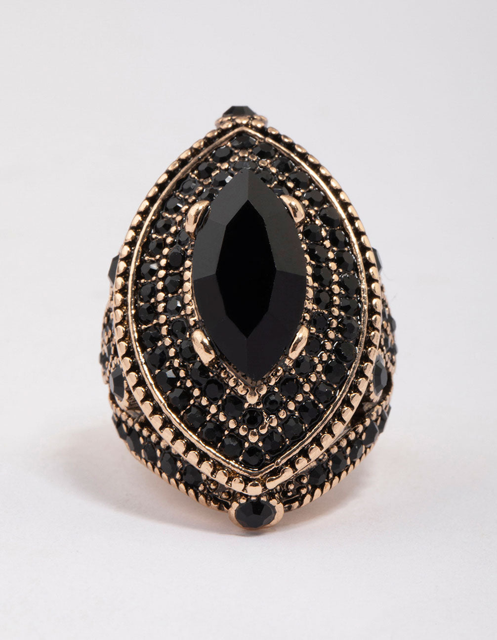 For a captivating touch to your stack, style this gold-toned cocktail ring. This statement ring features a pear-shaped design, adorned with black crystals for a boho-inspired finish.