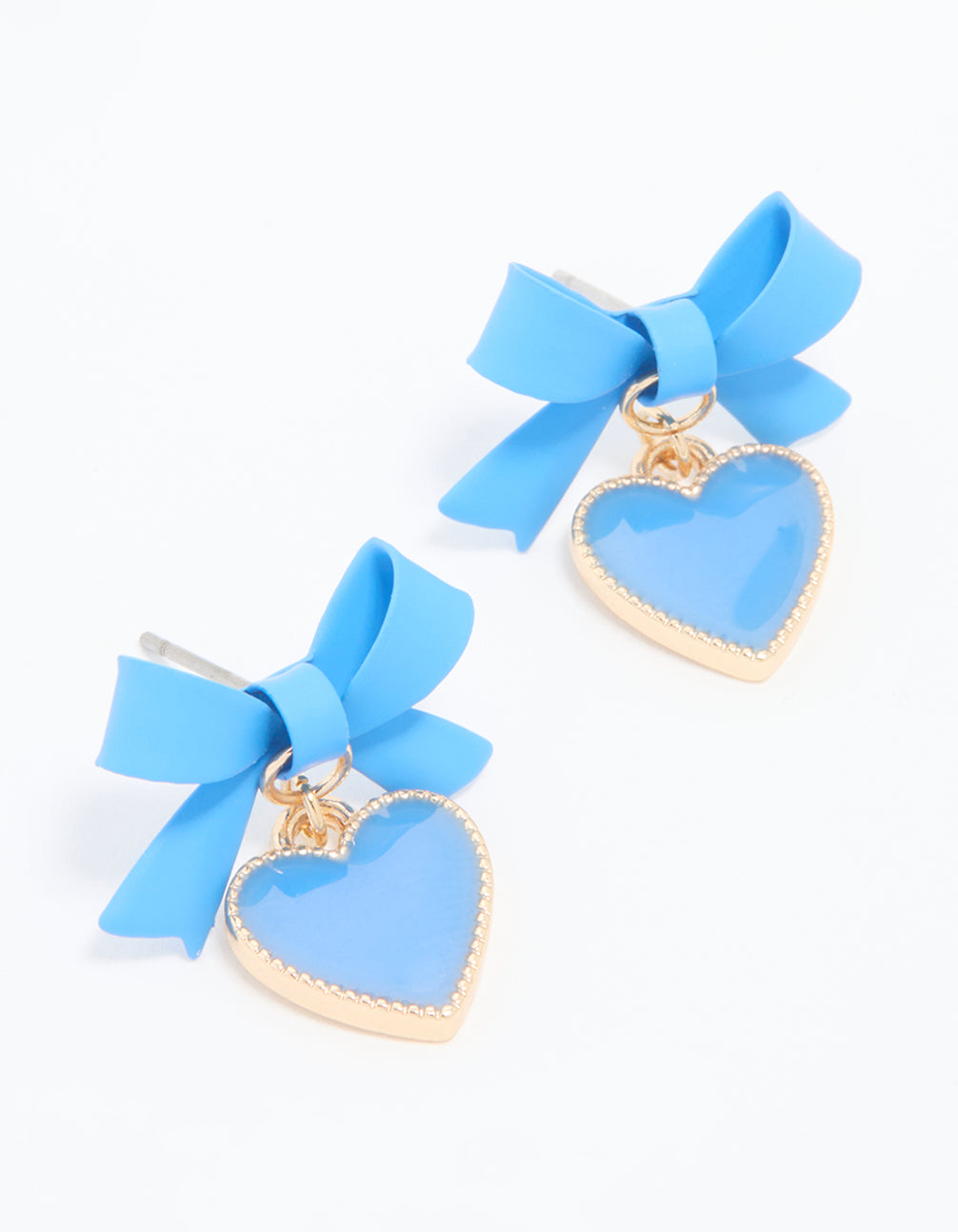 Gold Blue Coated Metal Bow Heart Drop Earrings