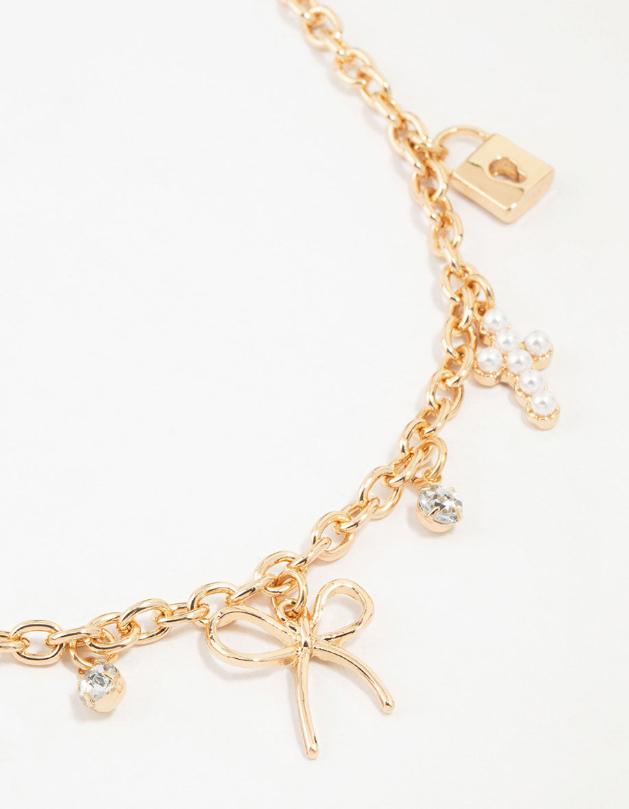 Instantly upgrade your style with this gold-toned charm necklace! Featuring bows, crosses, a lock, and sparkling diamante crystals, it's perfect for a playful yet sophisticated vibe.