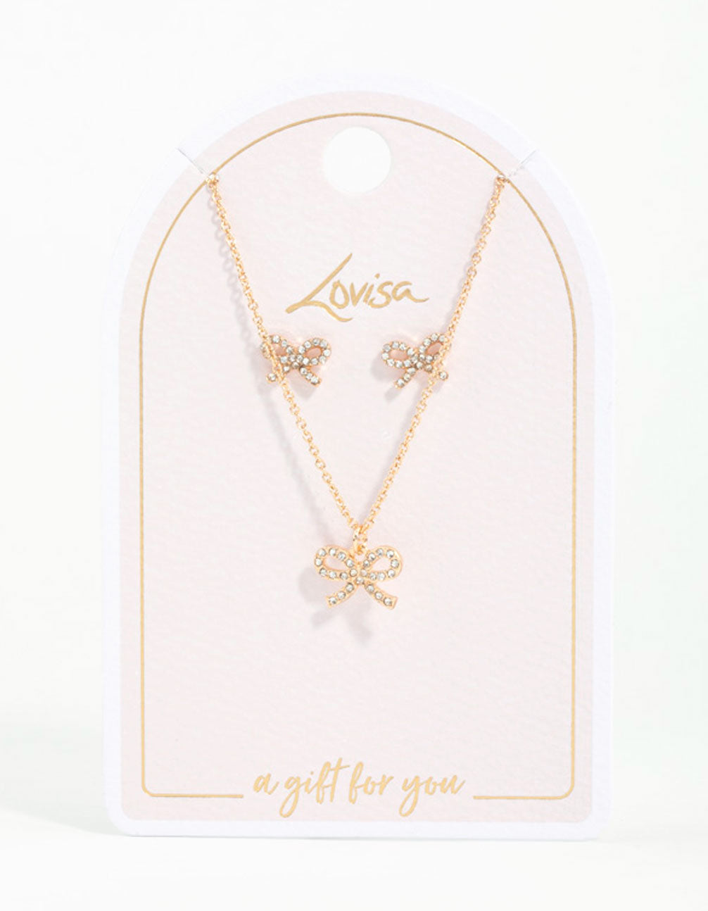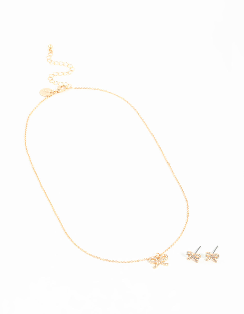 Gift effortless style with this gold-toned jewelry set! Featuring a coquette-inspired diamante bow necklace and matching earrings, it's perfect for a chic and elegant look.