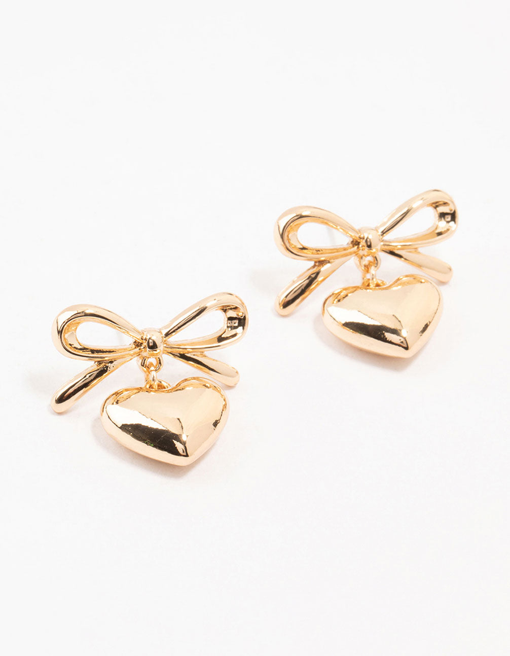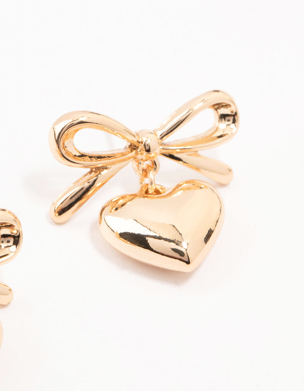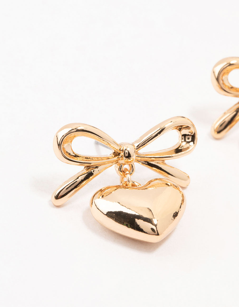 Dazzle with these Gold Bow and Puffy Heart Drop earrings. This stylish blend of chic and playful details creates a statement coquette inspired piece that's sure to turn heads.
