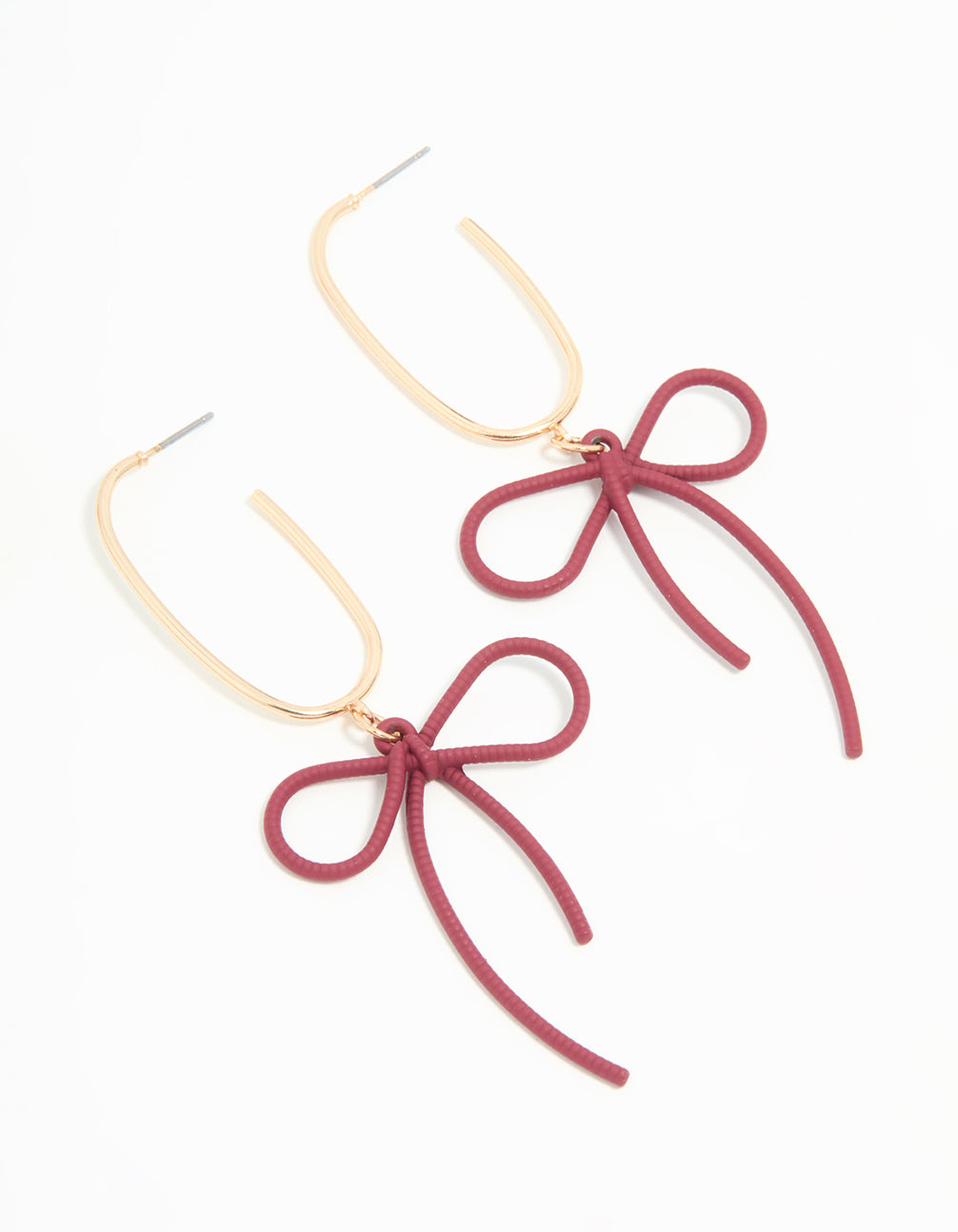 Add a playful yet elegant twist to your accessory game with these Gold Burgundy Bow Drop Earrings. These stunning hoop earrings feature a chic bow design in a rich burgundy hue, paired with a sleek gold-toned finish for a luxurious vibe. Perfect for parties, date nights, or dressing up your everyday look, they bring a pop of colour and sophistication to any outfit. Style them with a flowy dress for a romantic touch or pair them with a blazer and jeans for effortless flair. Whether you're after statement earrings, fashionable drops, or something uniquely charming, these versatile beauties tick all the boxes!