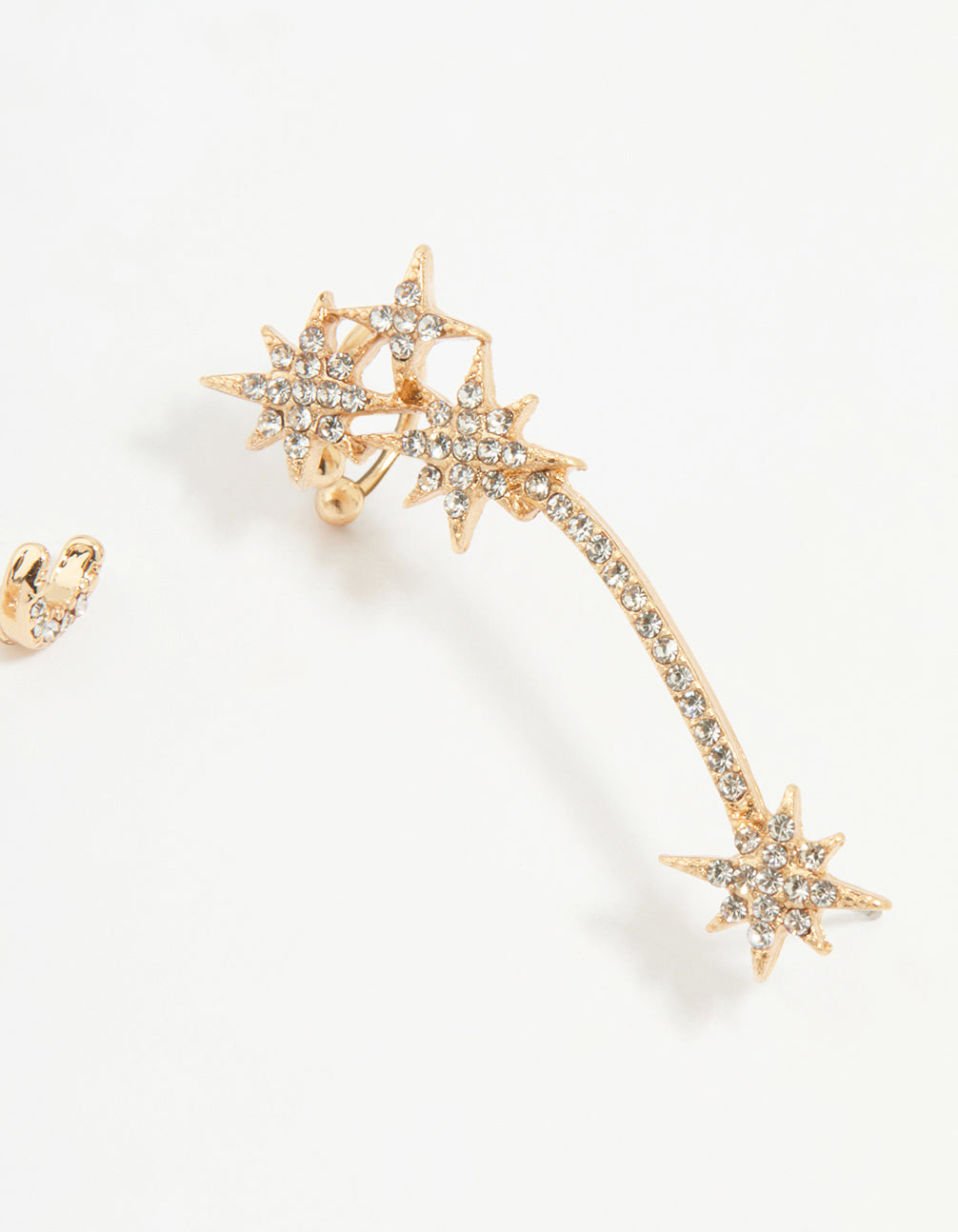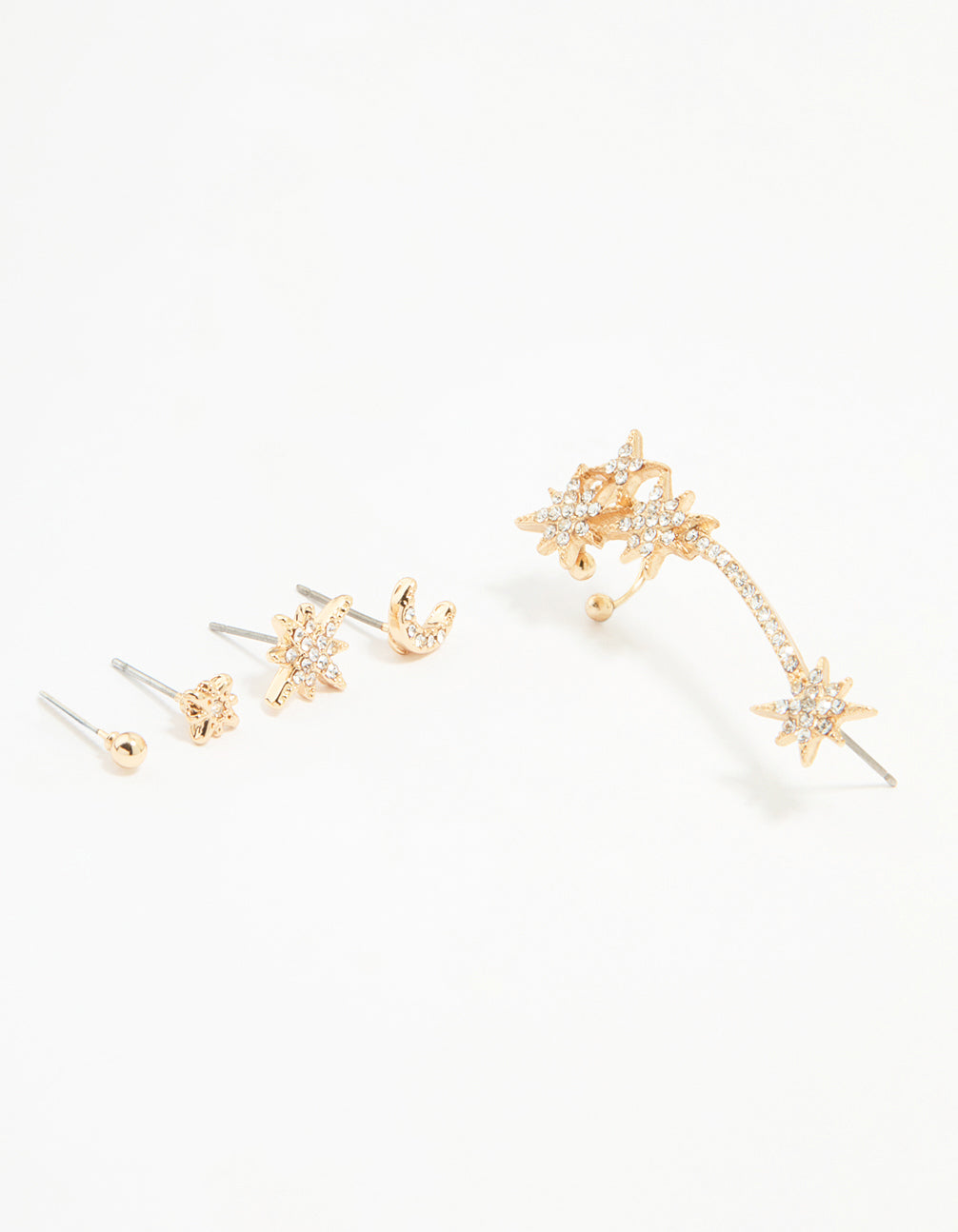 Elevate your ear game with this Gold Celestial Stacking Earrings Pack. This set includes a sleek gold-tone ball stud, a decorative stud with a cubic zirconia crystal centre, a sparkling star stud, a crescent moon stud, and a standout star crawler stud that adds a stylish stacked look. Perfect for layering or wearing solo, these delicate yet bold designs bring a celestial vibe to any outfit. Whether you're heading to brunch, a night out, or just jazzing up your everyday style, these gold-tone earrings are your go-to. Pair them with casual denim or a chic dress for effortless sparkle.