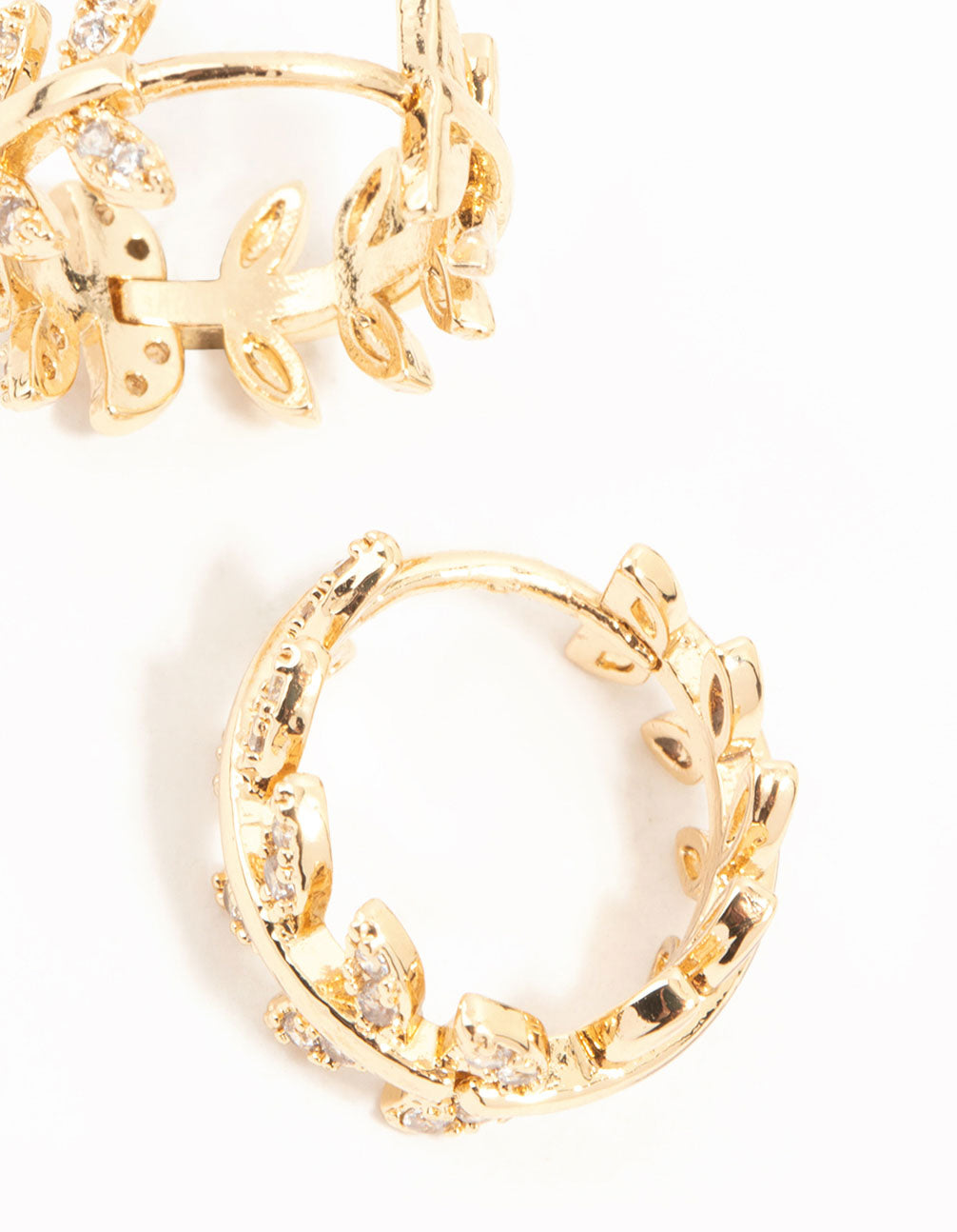 Gold Cubic Zirconia Leafy Huggie Earrings