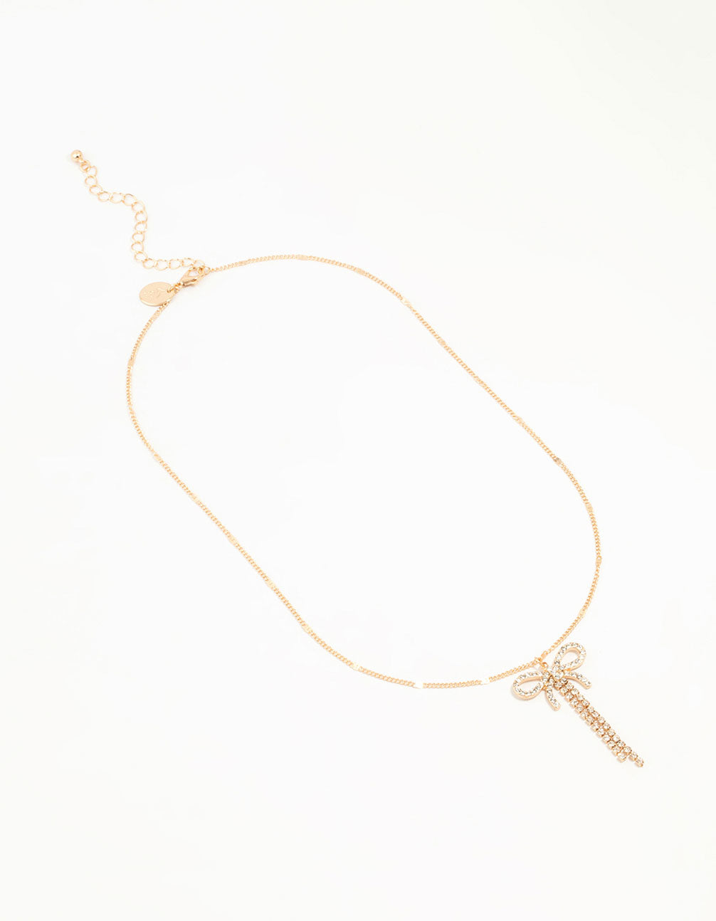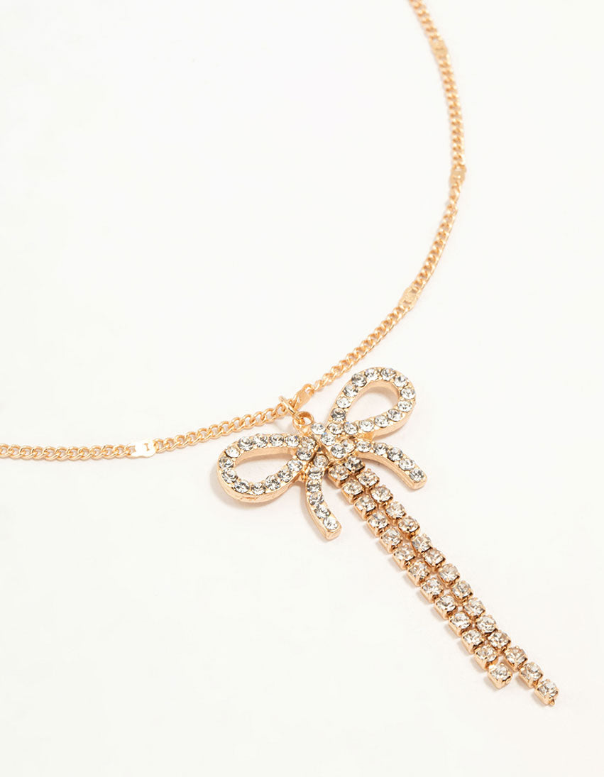 This stunning pendant necklace features a delicate bow design adorned with sparkling diamante crystals on a sleek gold-toned chain. Ideal for any occasion.