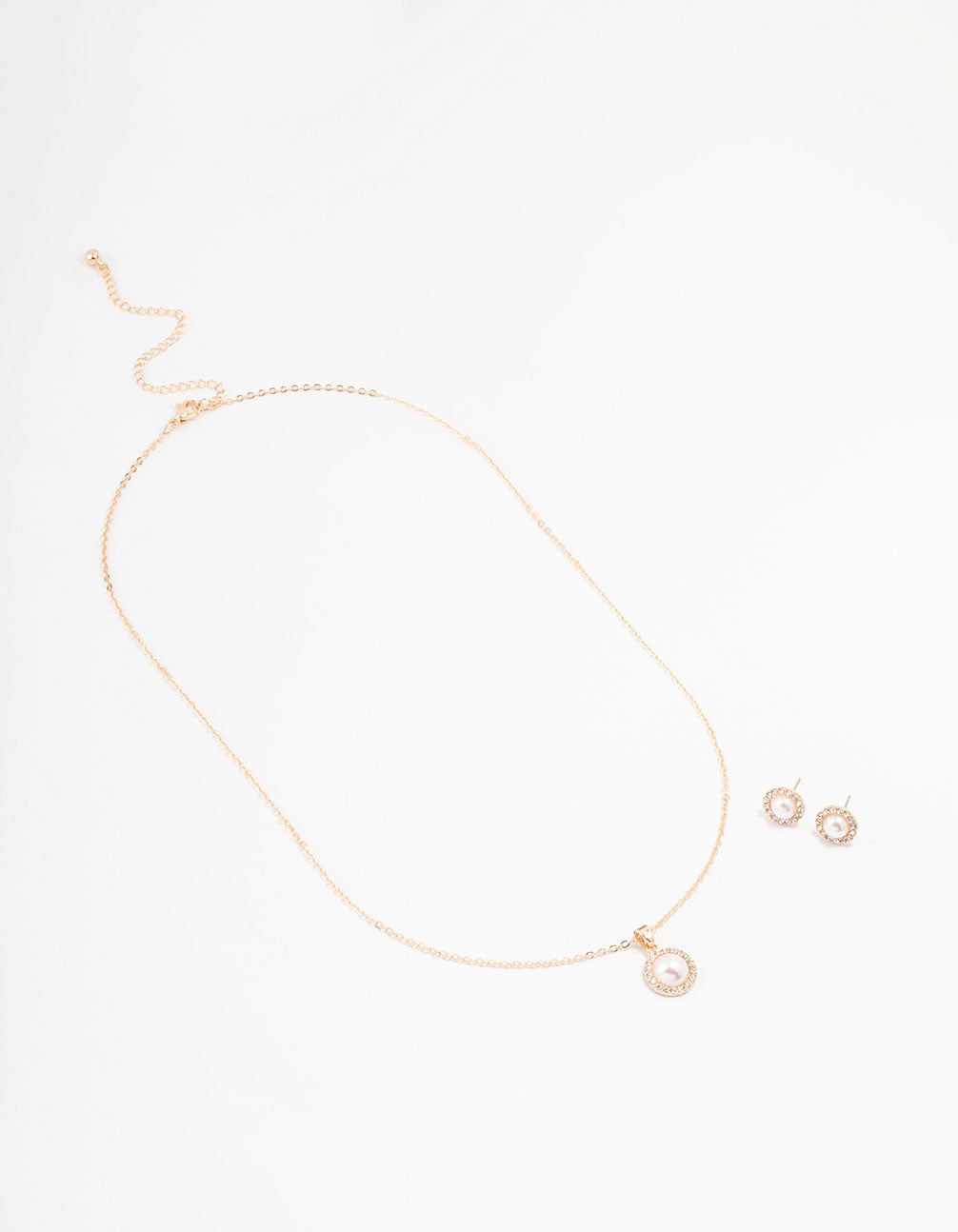 Gold Diamante & Pearl Halo Necklace & Stud Earrings Set