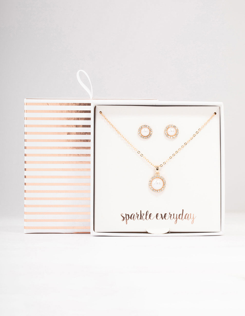 Explore our Gifting Collection for memorable moments, elegantly wrapped. Treat your loved ones to a chic set they'll cherish forever: this set includes a gold diamante and pearl halo necklace and stud earrings. It's perfect for expressing love.