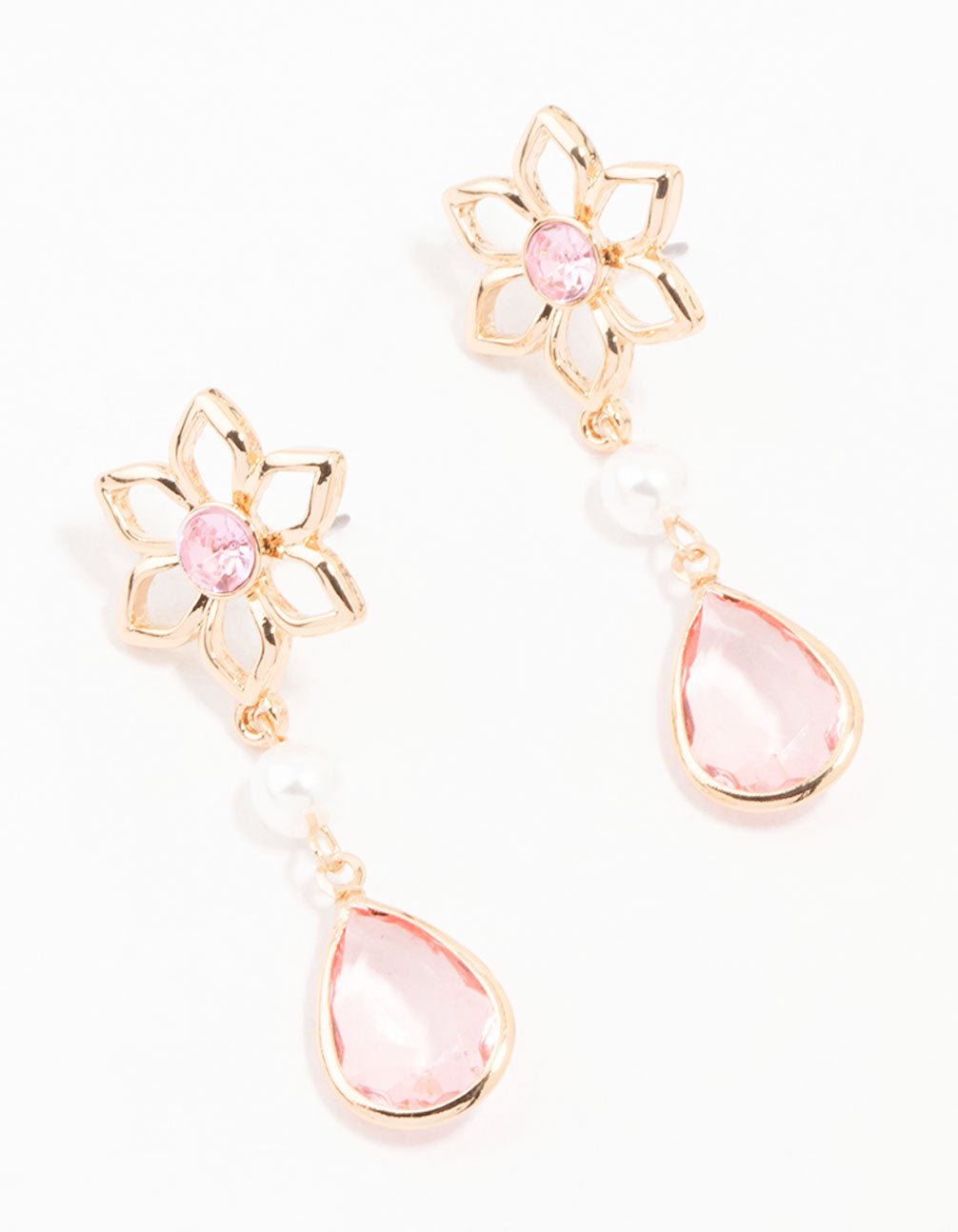 Gold Flower, Pearl & Pink Pear Diamante Drop Earrings