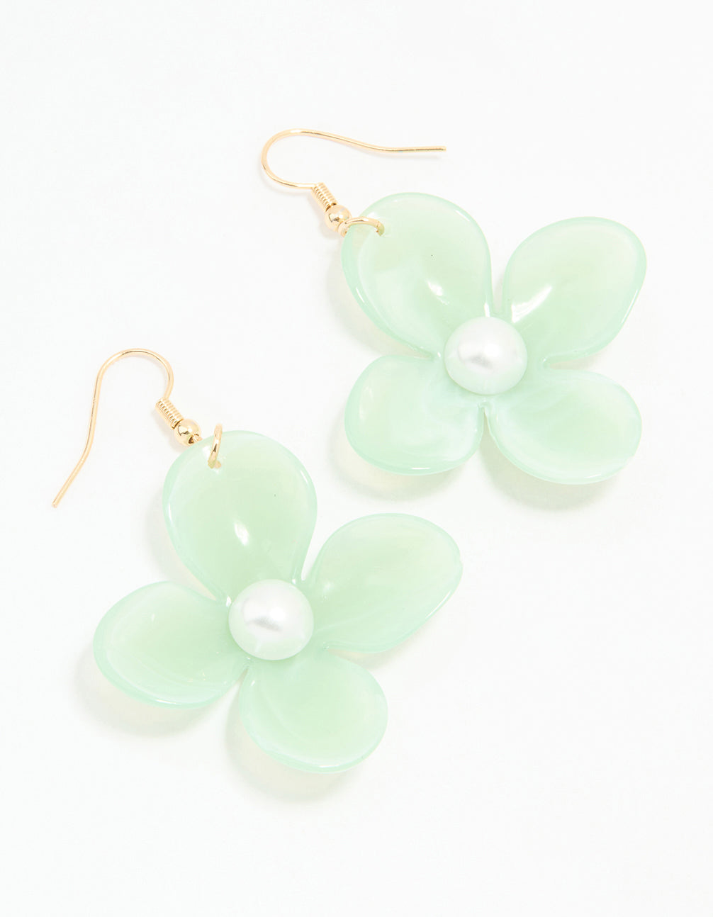 Gold Green Acrylic Pearl Center Flower Drop Earrings