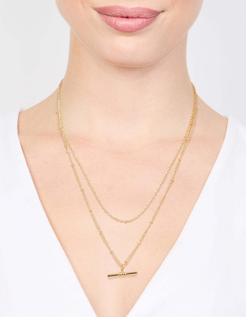 Upgrade your style with this stylish layered bar necklace in gleaming gold. Its adjustable length allows for versatile styling, and its trendy bar and chain layered design is perfect for adding a touch of refined elegance to any outfit.