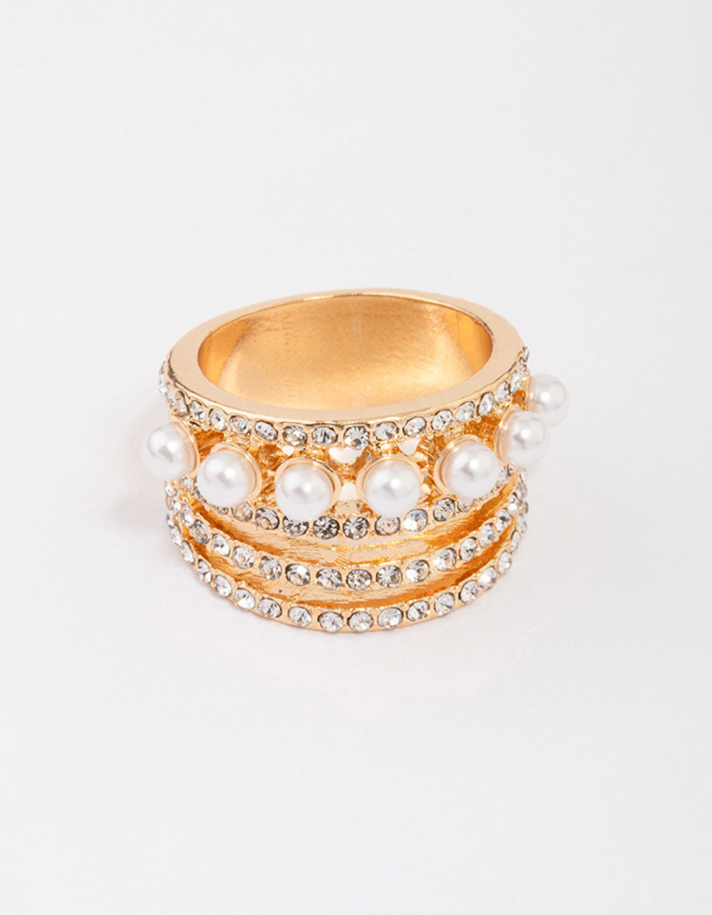 For an elegant finish to your stack, style this gorgeous gold-toned ring. This ring features a chunky band, adorned with layers of diamantes and pearls for an embellished look.
