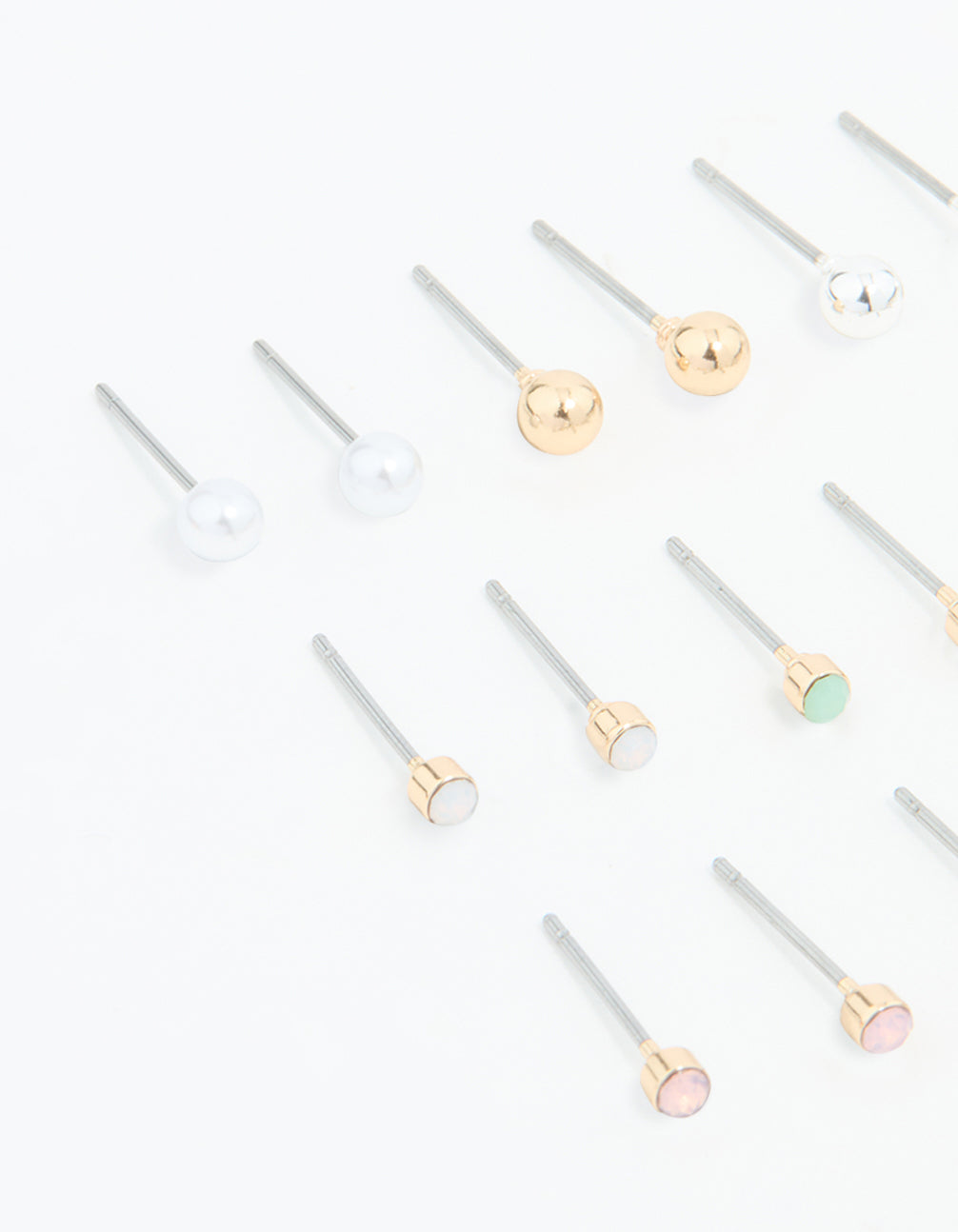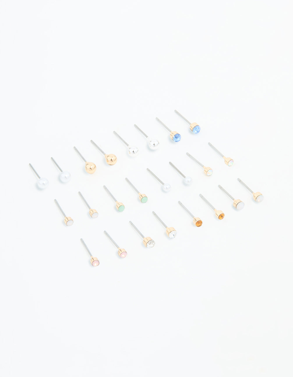 Upgrade your look with this stunning gold-toned stud pack! Featuring 8 studs including pearls, gold tones, and multicoloured diamantes for a minimalistic touch.