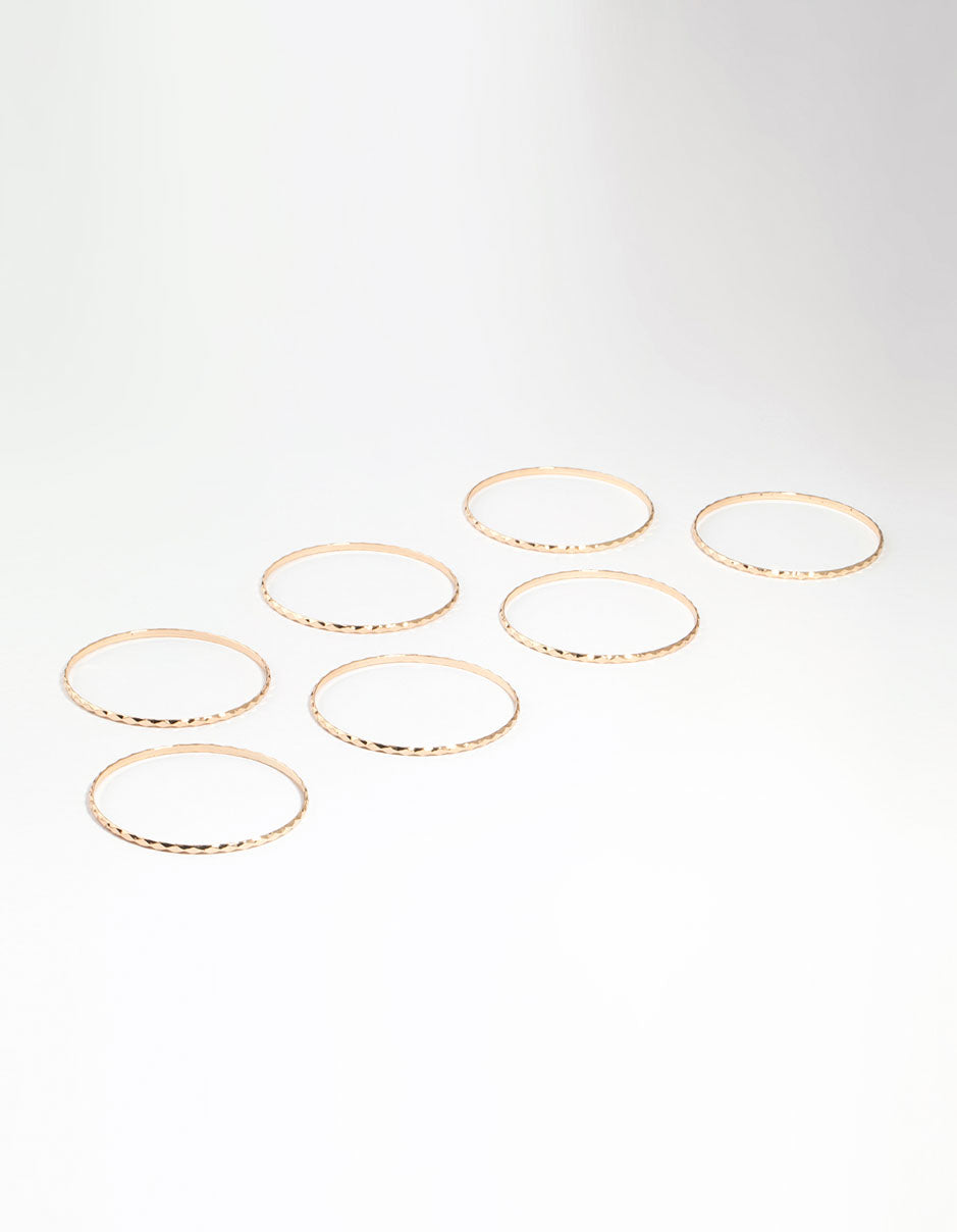 Build a chic wrist stack with this stunning gold-toned set! Featuring 7 sleek molten finish bangles, it's the perfect blend of minimalistic and fun for a sophisticated touch.