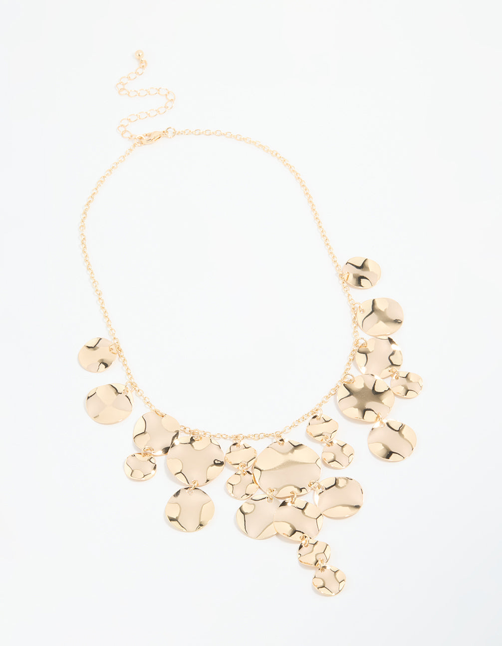 Make a statement with this Gold Organic Disc Droplet Necklace. Designed as a statement necklace, this piece features organic disc shapes with a warm gold finish, offering a contemporary yet timeless appeal. Perfect for dressing up or down, its bold yet elegant design makes it ideal for special occasions or adding a touch of glamour to your everyday look. Pair it with a sleek blouse or a flowy dress for effortless sophistication. Whether you're searching for gold necklaces, statement jewellery, or something unique to elevate your outfit, this necklace is your go-to accessory. Versatile, stylish, and beautifully crafted, it's a must-have for jewellery lovers.