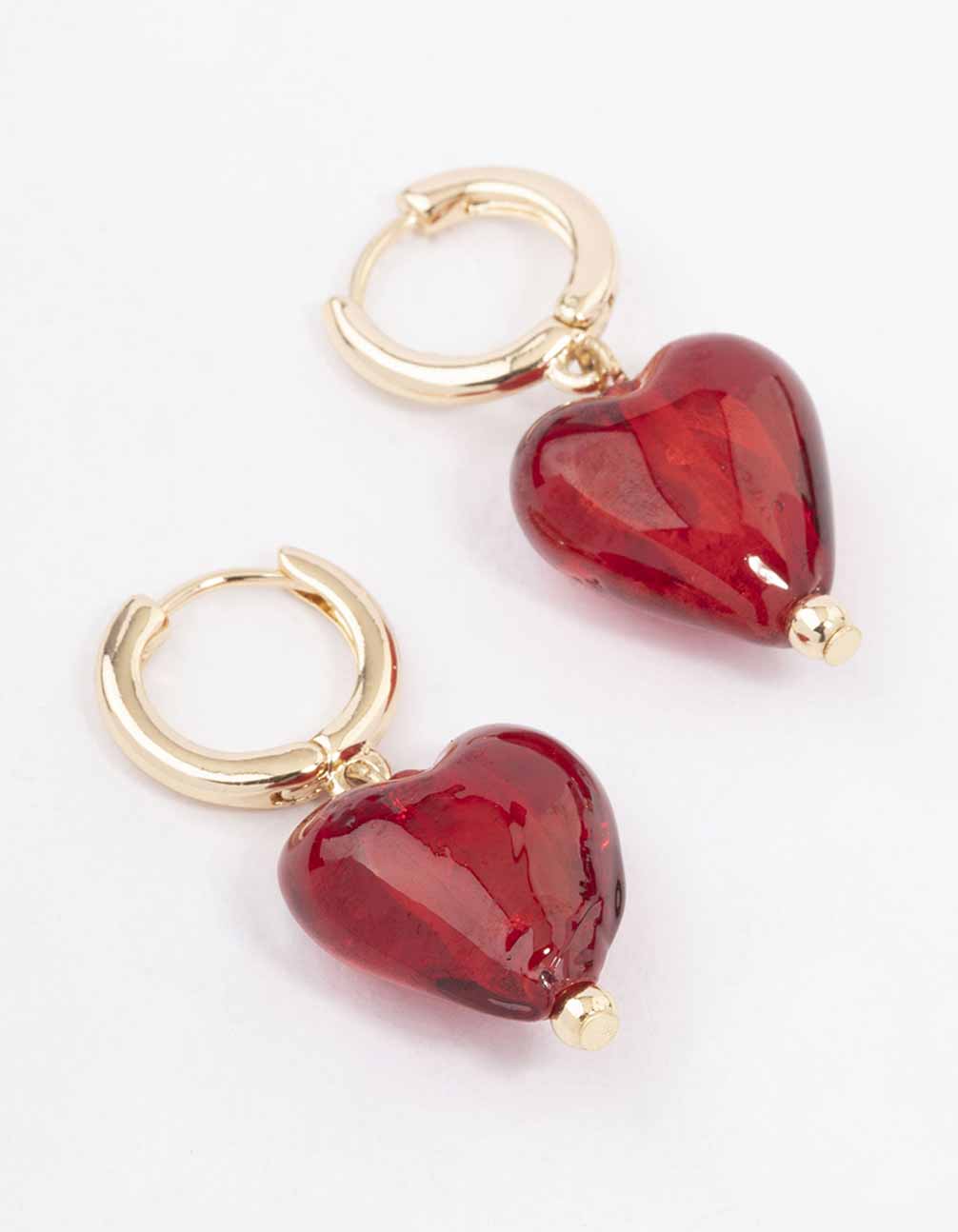 These fine, gold hoop earrings feature red puffy hearts for a lovable and on-trend look.