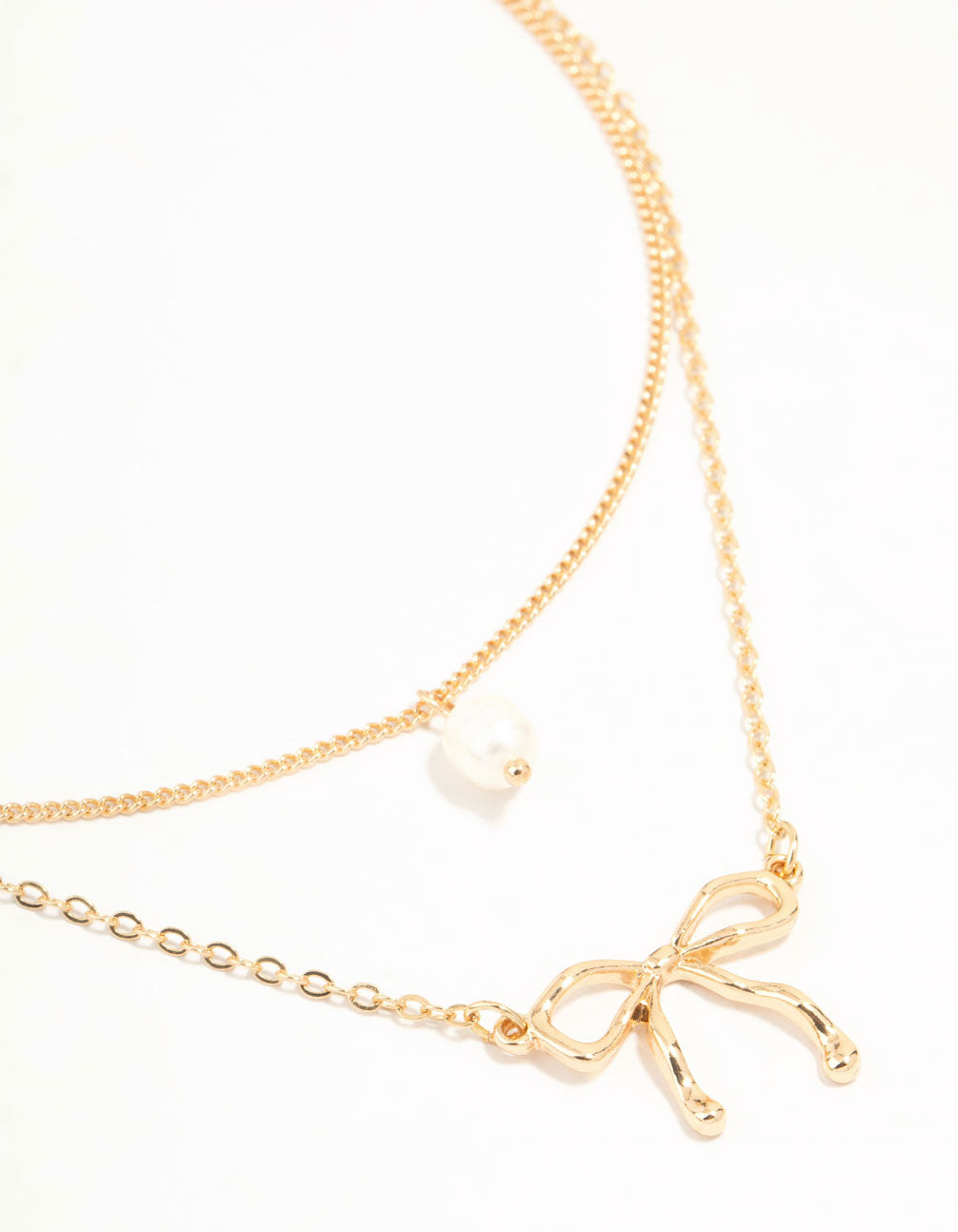 Elevate your look with the captivating Gold Pearl & Bow 2 layered Necklace. This necklace blends shimmering pearls and delicate bows for a chic, feminine finish.