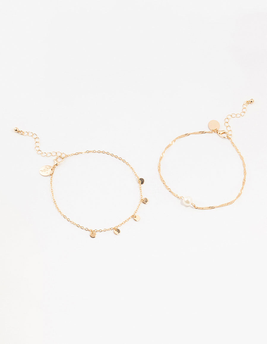 Gold Pearl Disc Pendant Anklets 2-Pack