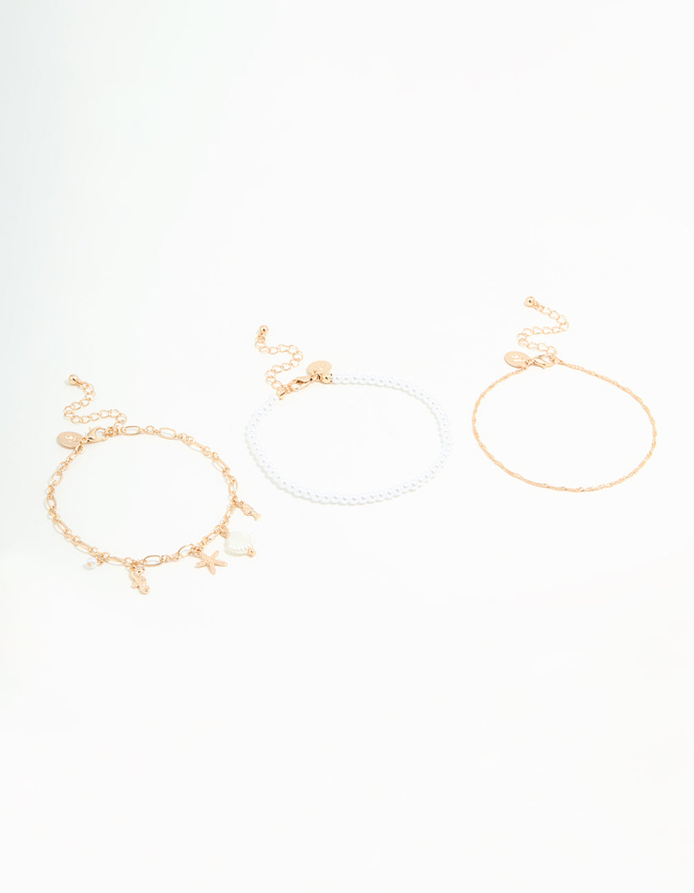 Shine bright with our Gold Pearl Sea Anklets 3-Pack set! This set features sea-inspired anklets and is perfect to rock for beach days or adding some seaside fun to any outfit.