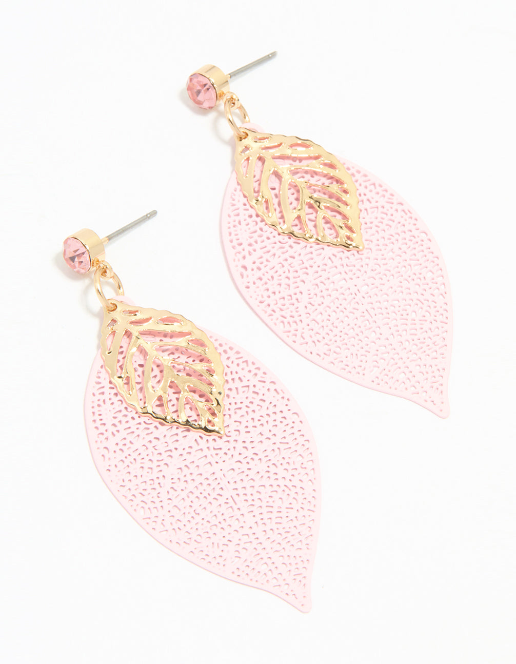 Add a pop of colour and charm to your jewellery collection with these Gold Pink & Filigree Leaf Drop Earrings. These stunning drop earrings feature delicate filigree detailing paired with soft pink accents, creating the perfect blend of elegance and playfulness and features two leaves layered over each other. Whether you're dressing up for a wedding, a dinner party, or simply want to brighten your everyday outfit, these earrings are an ideal choice. The graceful leaf shape adds a nature-inspired touch, while the gold finish ensures timeless versatility. Pair them with a flowy maxi dress for a boho vibe or with tailored trousers and a blouse for a chic, polished look. Perfect for anyone searching for statement earrings, nature-themed designs, or lightweight jewellery, these beauties are a must-have accessory for every occasion!
