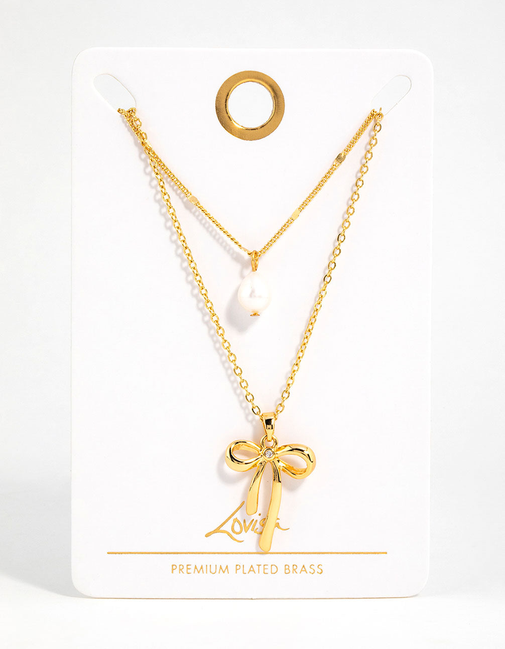 Gold Plated Brass Freshwater Pearl & Bow Layered Necklace
