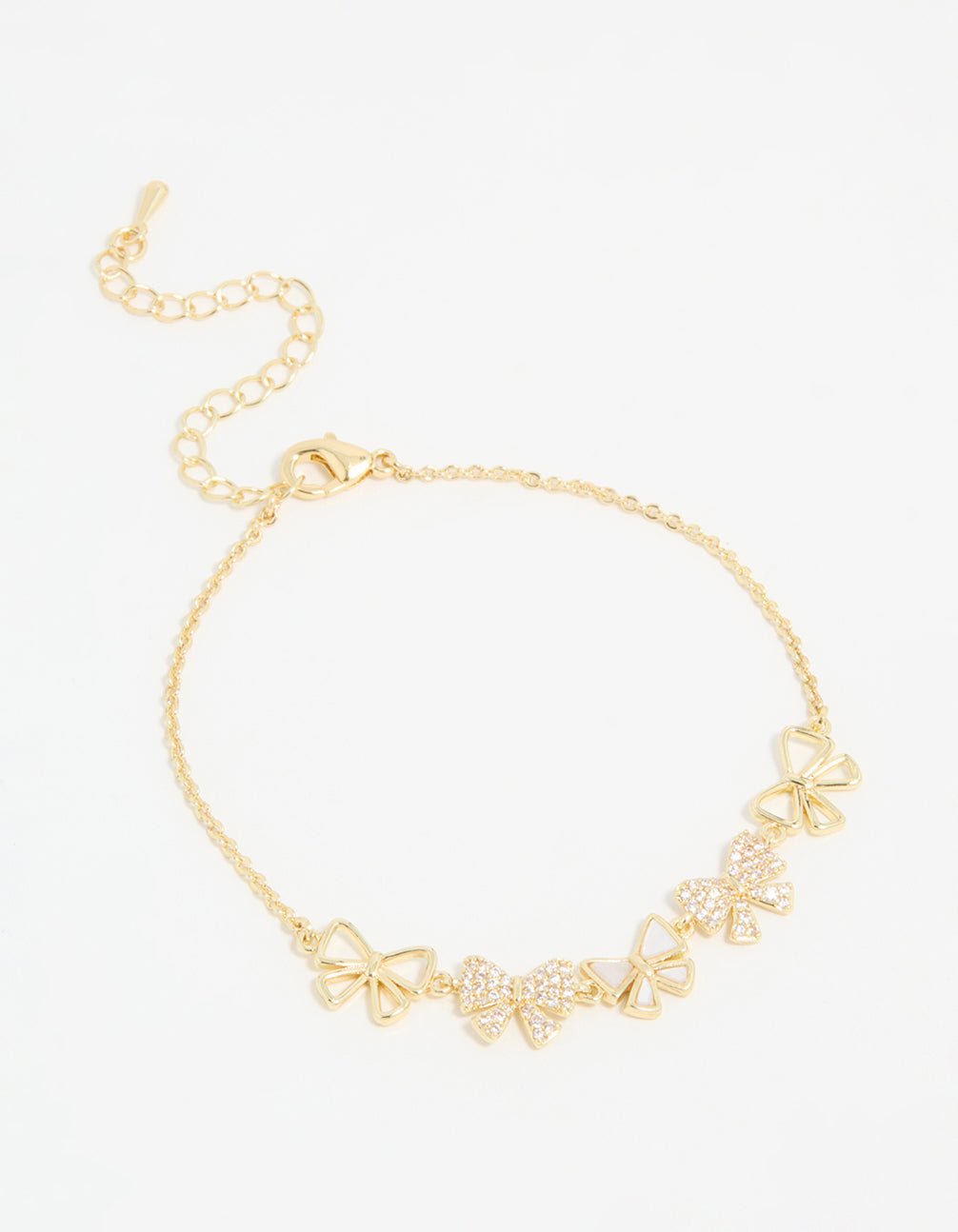 Step up your style with the Gold Plated Cubic Zirconia Bows Bracelet! Featuring delicate cubic zirconia bows, this luxe bracelet adds a touch of bling to any outfit