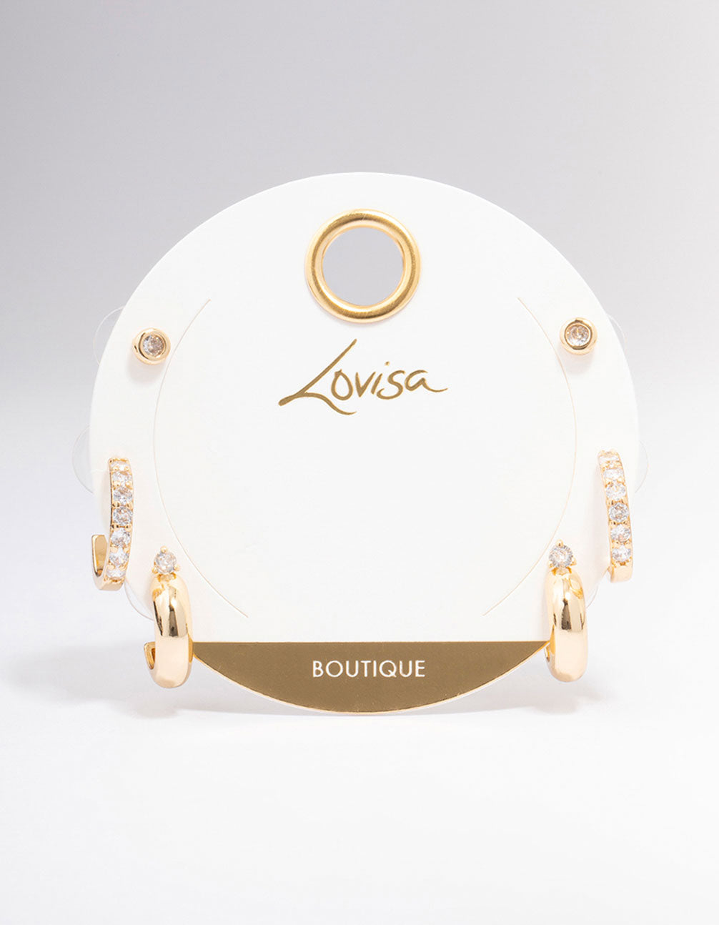 For a curated finish to your look, style these gorgeous gold plated earrings. This earring pack contains three individual sets of hoops and stud earrings, perfect for pairing together for styling solo for an understated look.