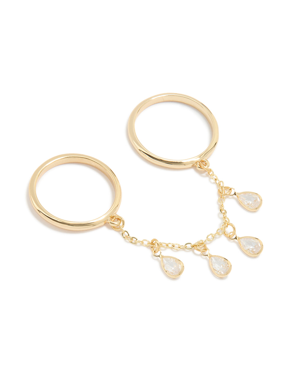 Elevate your jewellery game with this Gold Cubic Zirconia Drop Chain Ring. Crafted with a gold-plated finish, this unique design features two interconnected rings linked by a delicate chain adorned with dazzling cubic zirconia crystals. Wear one ring on each finger for an edgy vibe or stack both on a single finger for a chic, layered look. Perfect for everyday wear or special occasions, this versatile ring pairs beautifully with casual outfits, date-night dresses, or even office attire. Whether you're accessorising for brunch or a night out, this stacking ring adds a modern touch of elegance to any outfit. It's the ultimate mix of playful style and sophistication!