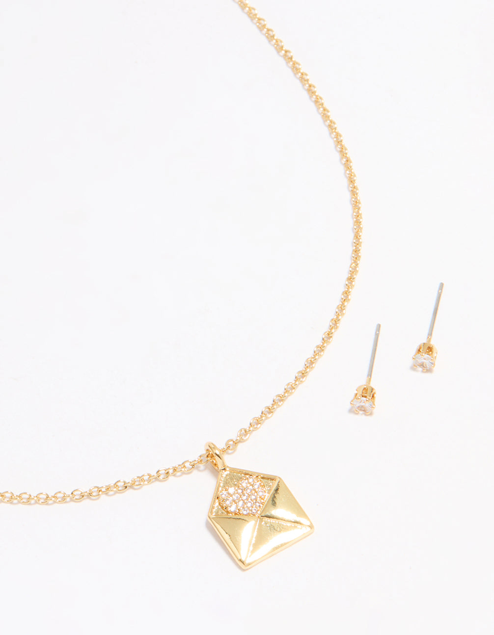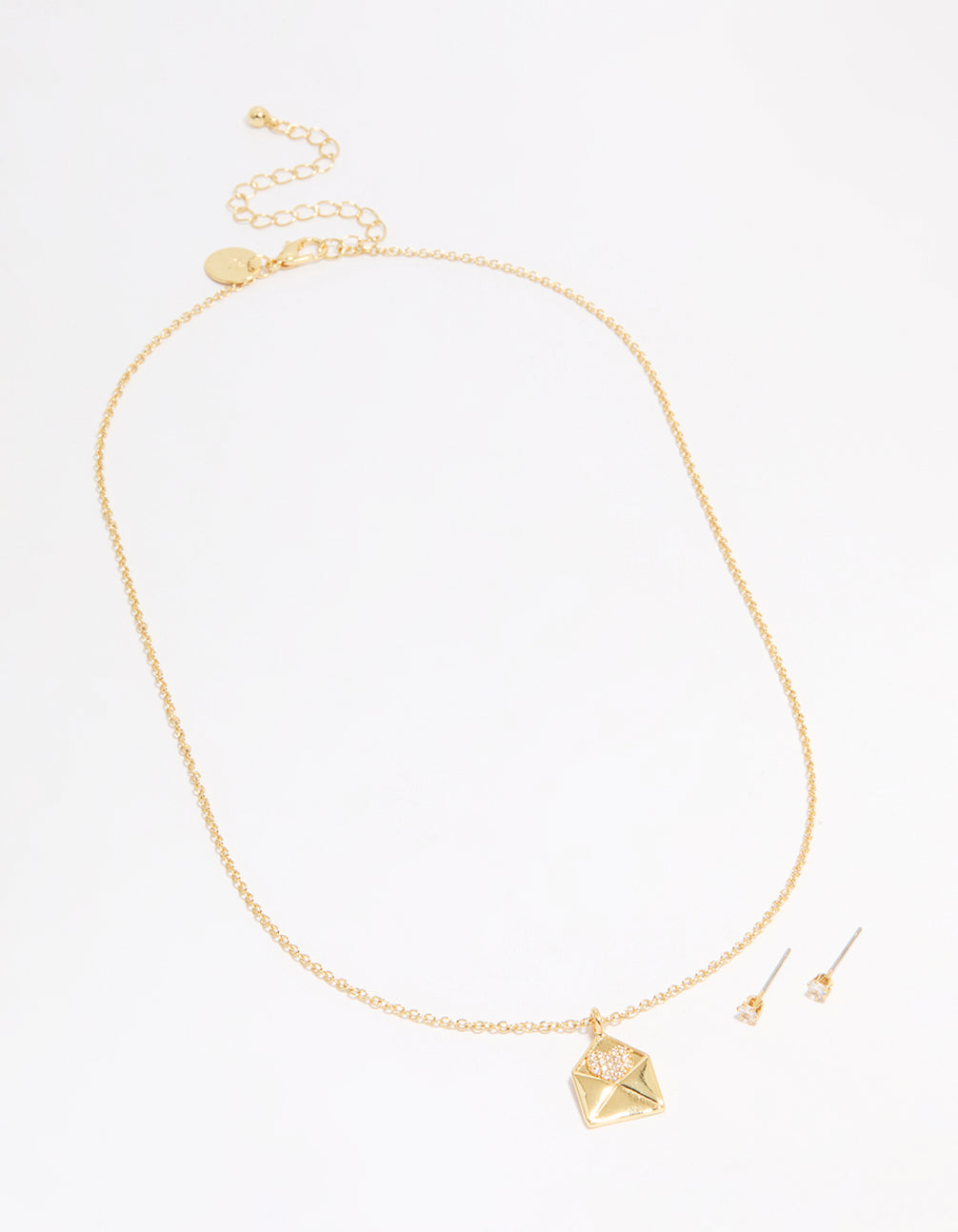 Gold Plated Cubic Zirconia Envelope Necklace & Stud Earrings Set