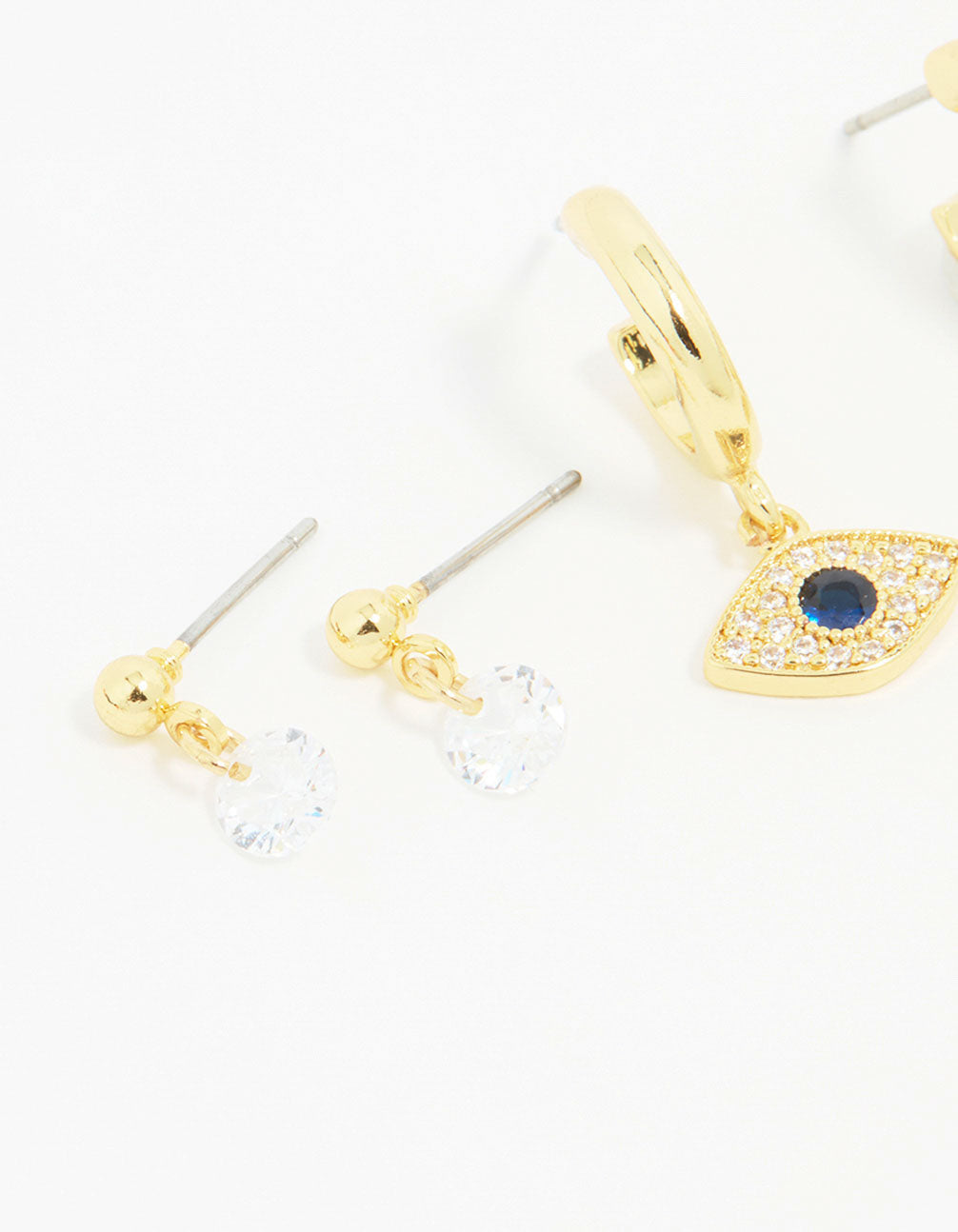 Gold Plated Cubic Zirconia Evil Eye Earrings 3-Pack