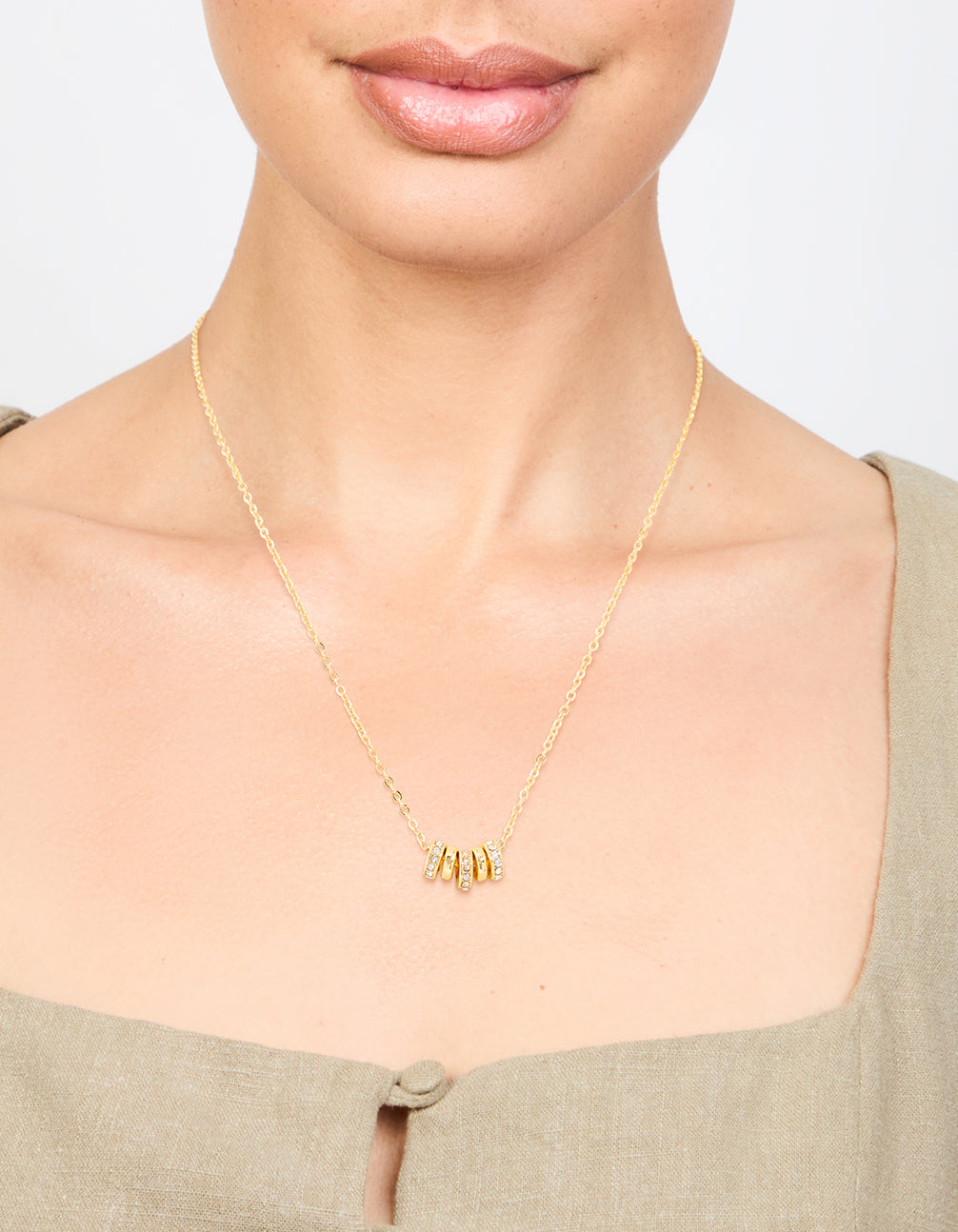 Add a touch of elegance to any outfit with this Gold Plated Cubic Zirconia Rondell Necklace. Featuring gleaming gold plating and sparkling cubic zirconia accents, this pendant necklace is all about timeless sophistication. The playful movable rondell pendants add a modern twist, making it perfect for both day-to-night looks. Pair it with a chic dress for a dinner date or layer it with other gold-toned jewellery for a trendy, stacked style. Whether you're dressing up for a special occasion or adding a hint of glam to your everyday wear, this necklace is a versatile must-have. Effortlessly stylish and endlessly wearable!