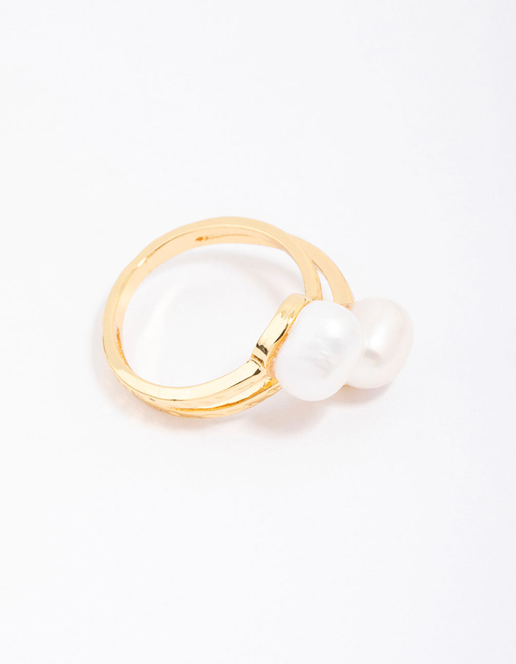 This ring is plated with real gold and features a wrapped design, adorned with two organic-shaped pearls for a refined finish.
