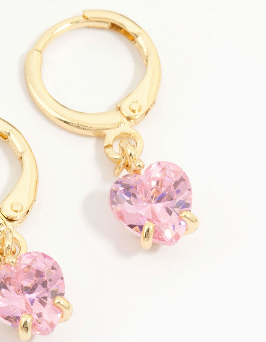 Add some charm with this gold-plated trio! Featuring sleek studs, pink cubic zirconia heart huggies, and flower earrings, it's perfect for a sweet and stylish look.