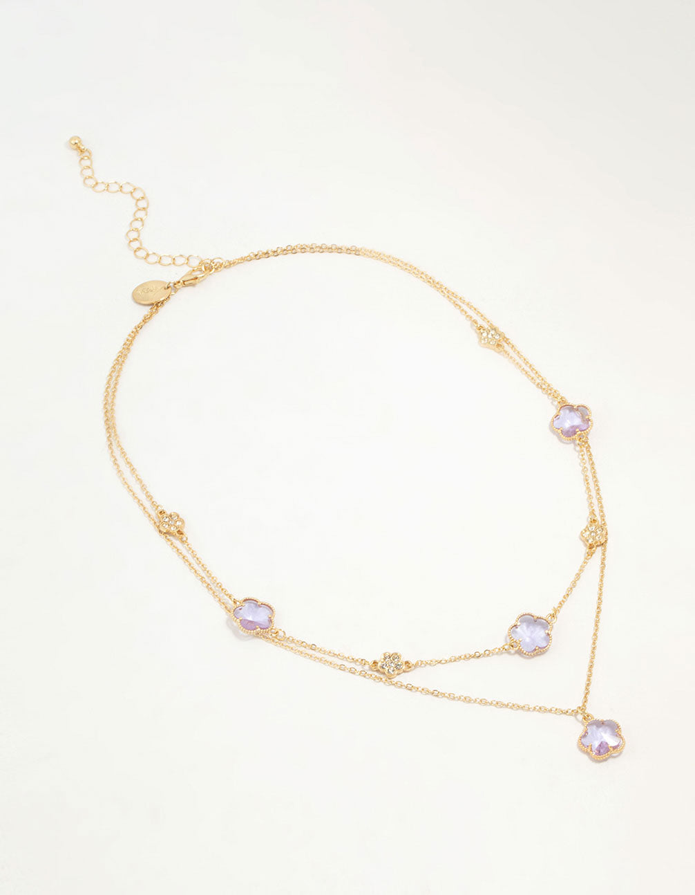 Add floral charm to your look with this gold-plated necklace! Featuring a purple cubic zirconia flower petal design and a layered style, it's perfect for an effortlessly cool look.