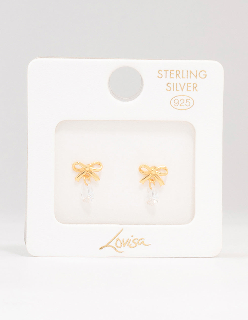 Bring more decor to your stack with these real gold sterling silver studs. These fun statement earrings feature a shiny bow silhouette and a pretty drop crystal for a coquette-inspired finish.