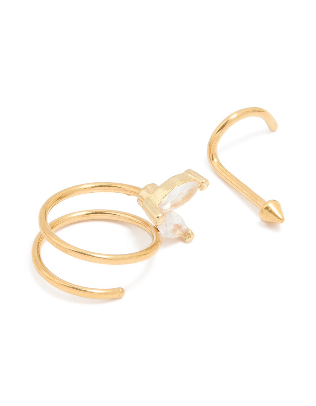 Add a touch of sparkle to your look with this Gold Plated Surgical Steel Cubic Zirconia Nose Hook Studs & Nose Ring Pack. This versatile set includes a sleek nose ring, a trendy hook stud, and a shimmering cubic zirconia stud, all crafted from durable surgical steel and plated in radiant gold for a luxurious finish. The cubic zirconia adds a subtle yet eye-catching sparkle, making these pieces perfect for everyday wear or dressing up for a night out. Whether you're pairing them with casual jeans and a jumper or accessorising a chic party outfit, this trio offers endless styling options. Ideal for nose piercings, the combination of classic and modern designs ensures you'll always have the perfect piece to match your mood.