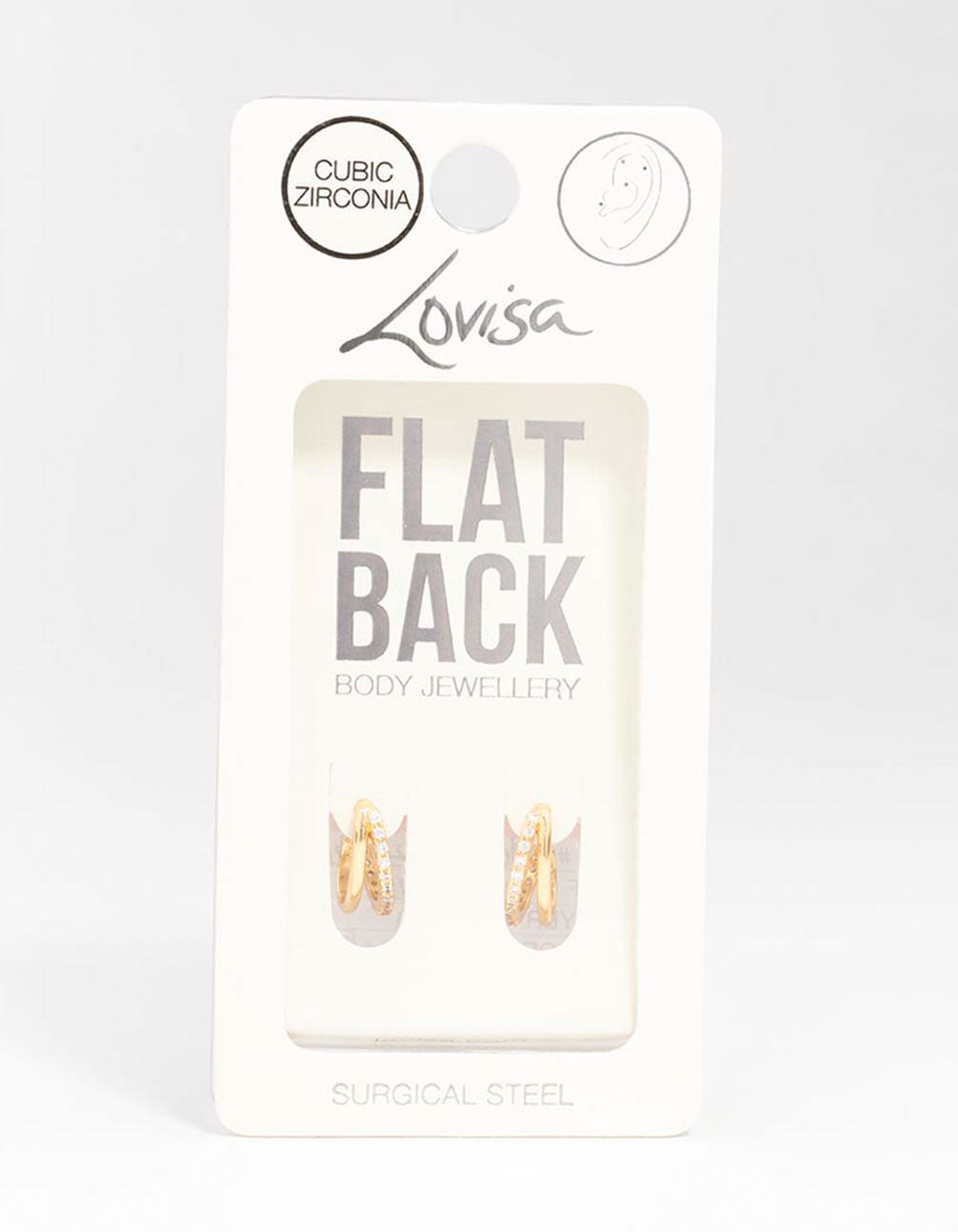 Gold Plated Surgical Steel Double Cubic Zirconia Hoop Flat Back 2-Pack