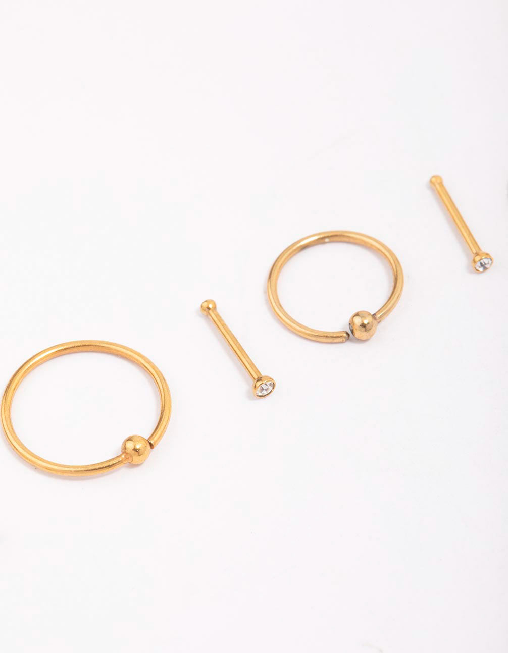 Customise your nose piercing with this pack of surgical steel body jewellery. This set of nose rings includes a mix of six different nose studs and rings, each plated with real gold for a premium finish.