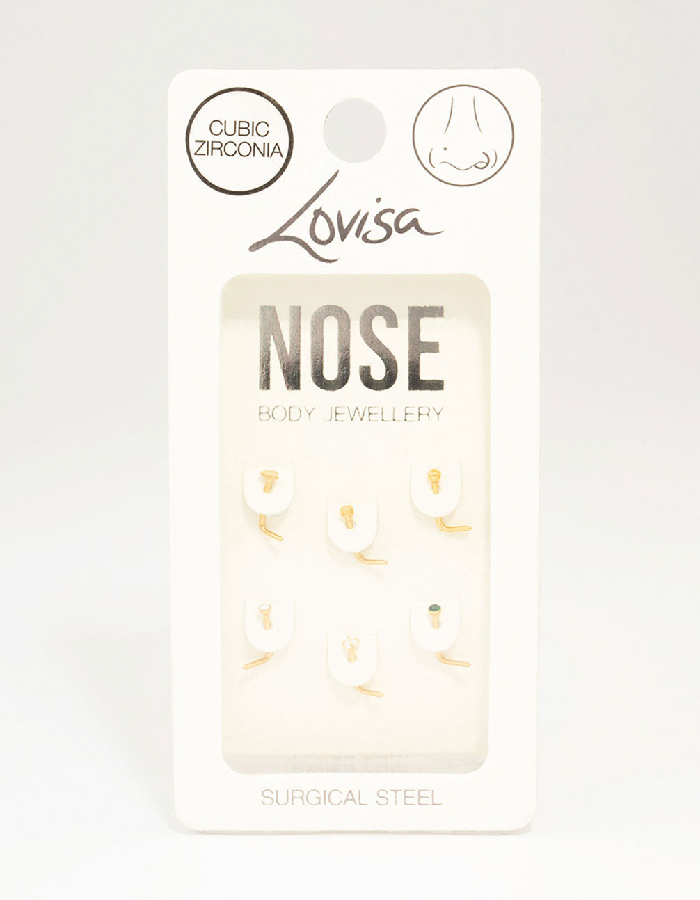 Customise your look with our selection of premium, genuine surgical steel piercing jewellery. This piercing pack contains six individual nose piercings, each plated with real gold and adorned with diamantes.