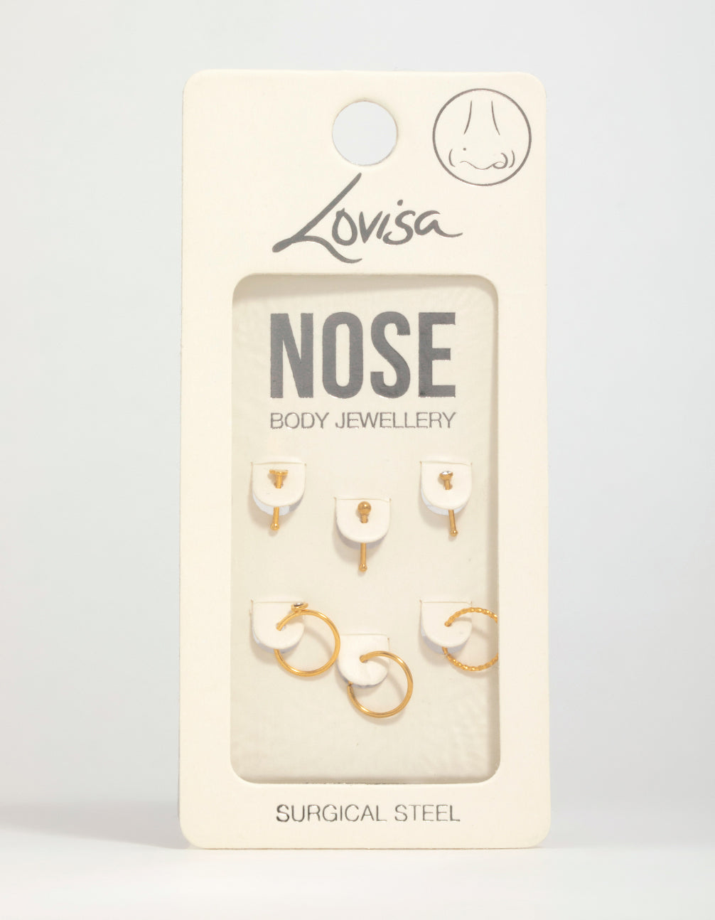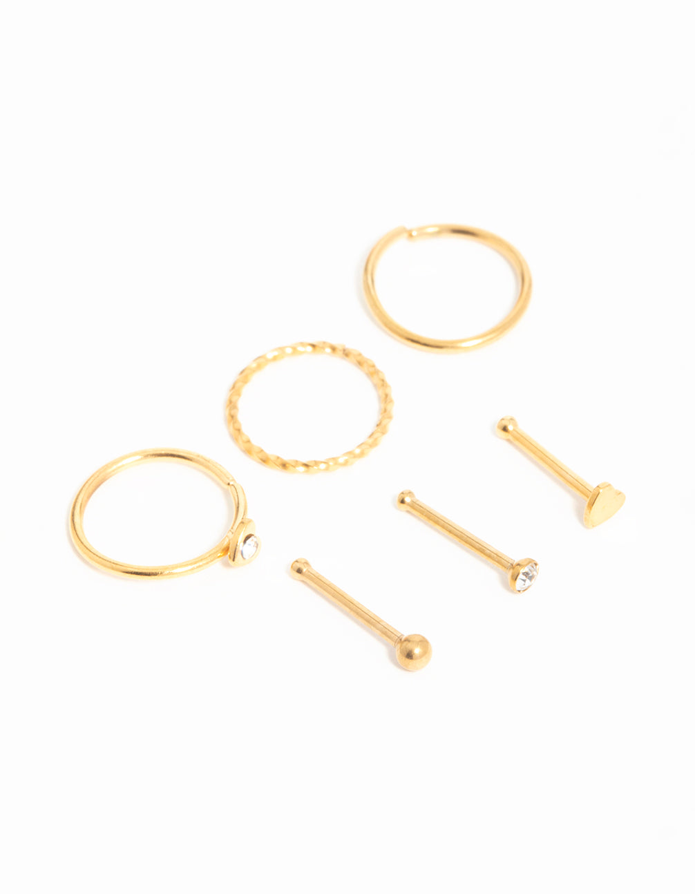 Add a little sparkle and a lot of charm to your piercing collection with this Gold Plated Surgical Steel Micro Heart Nose Piercing Pack! This gorgeous set of nose jewellery has everything you need to mix up your look. Featuring a heart-shaped cubic zirconia centre nose ring, a twisted nose ring, a sleek nose ring, a simple nose stud, a dazzling cubic zirconia nose stud, and a heart-shaped nose stud, it's the perfect mix of elegant and playful styles.