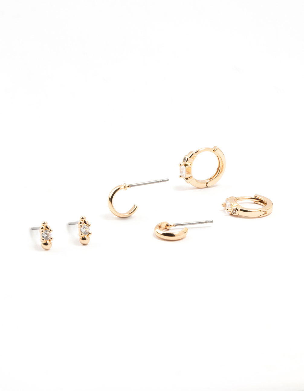 Upgrade your everyday earring game with this trio of brilliant styles. Featuring a sparkly stone hoop, shiny studs, and sleek gold hoops, wear them together for a fun stack or separately to add a touch of flair to your look.