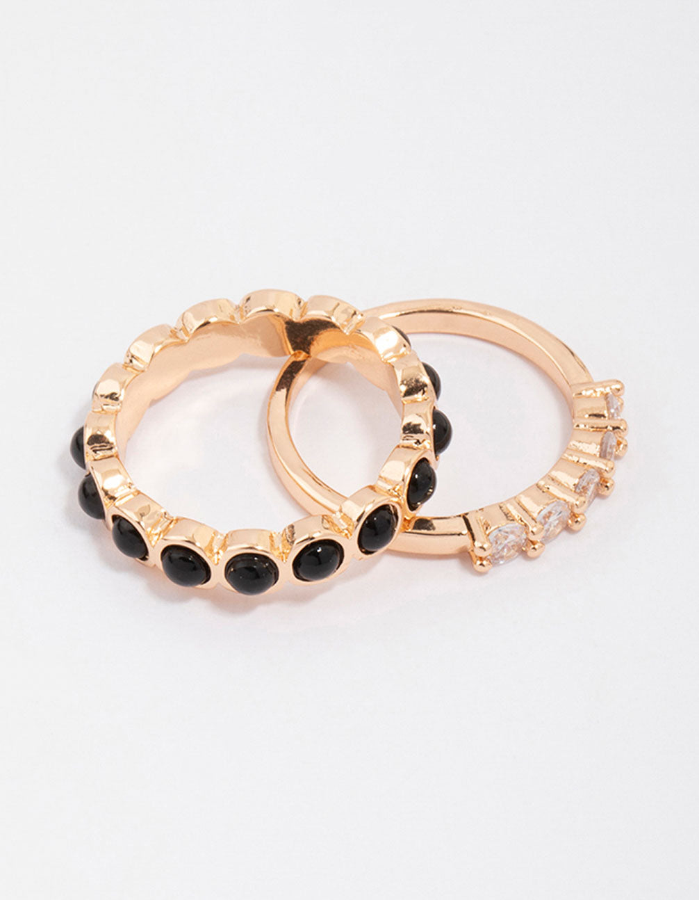 Embellish your look with these simple stacking rings! This dainty duo includes two gorgeous, gold-toned bands adorned with black and crystal diamantes for a two-toned inspired look. Layer them stacked ontop of each other for a curated finish.