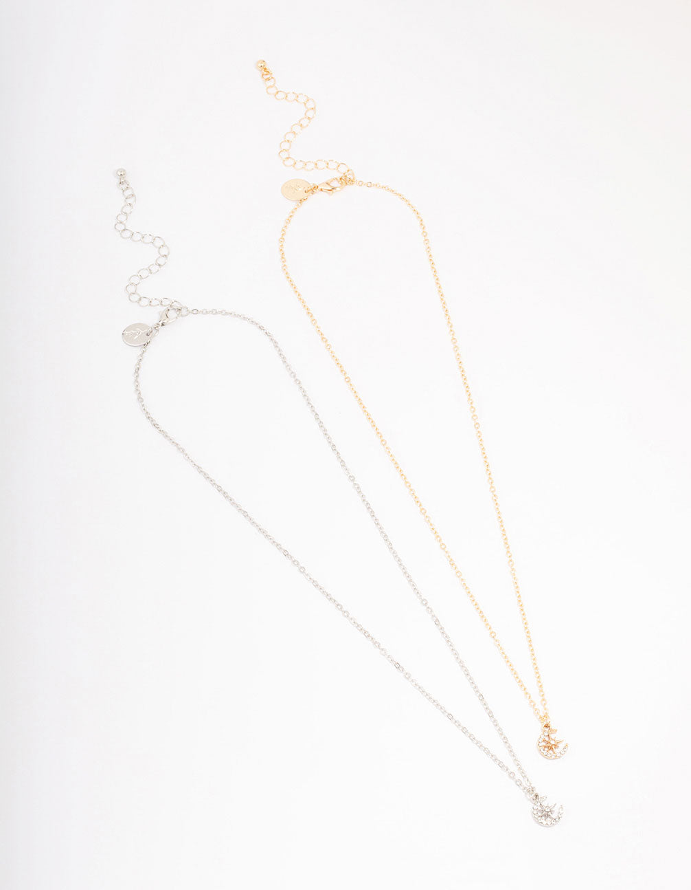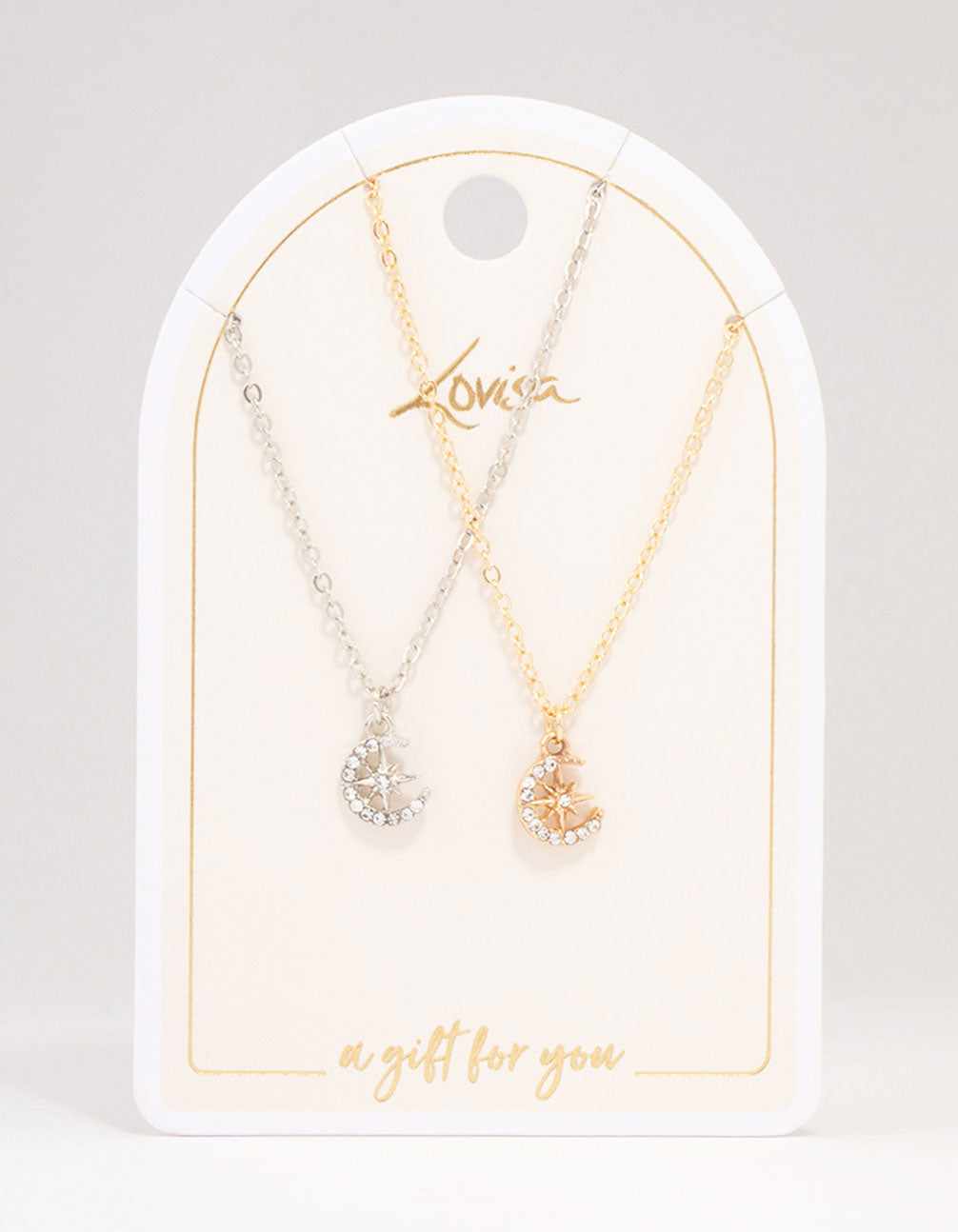 Add detail to your outfit with this two-toned, pendant necklace pack. This necklace duo includes a gold and silver chain, each designed with a diamante-encrusted half moon charm.