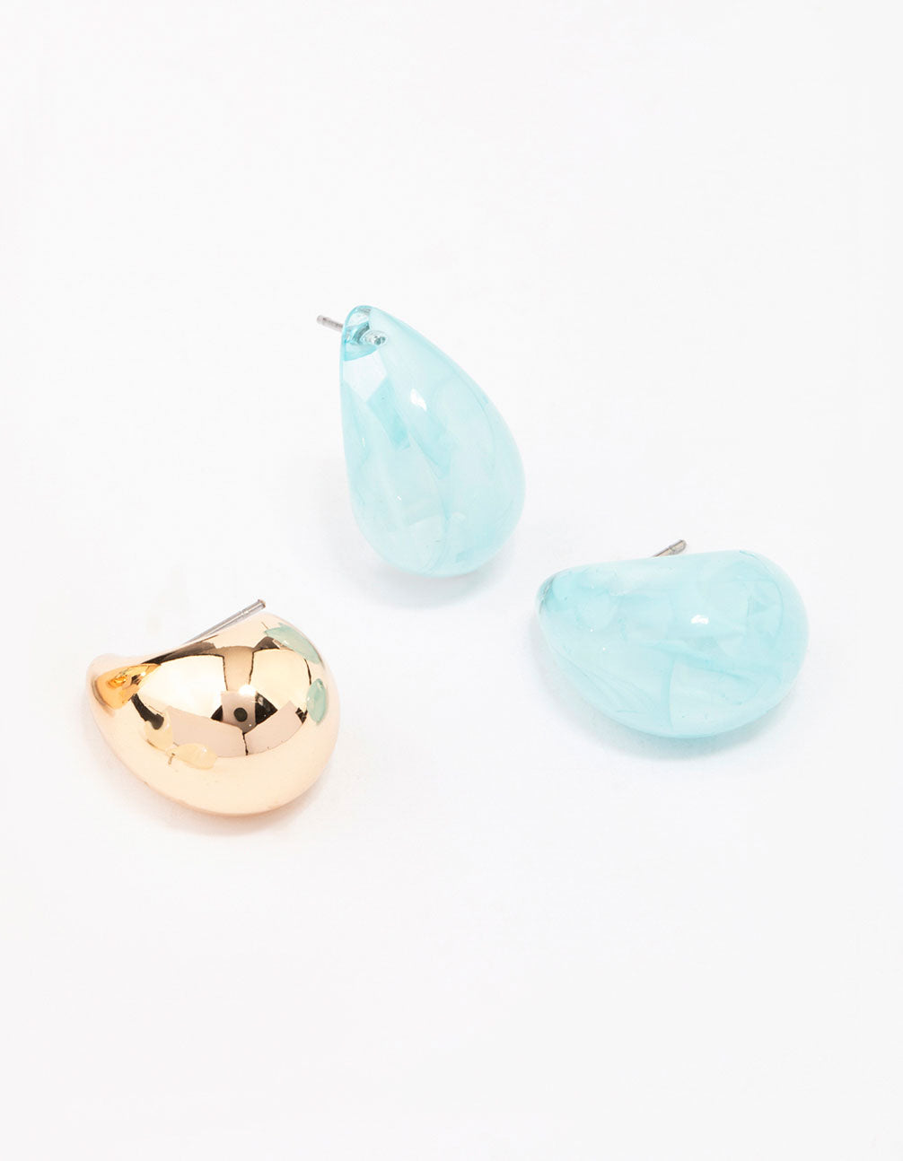 Make a splash with these mixed bubble style hoop earrings. With white, pastel blue and a classic gold hoops, it's the perfect summery vibe in one set.