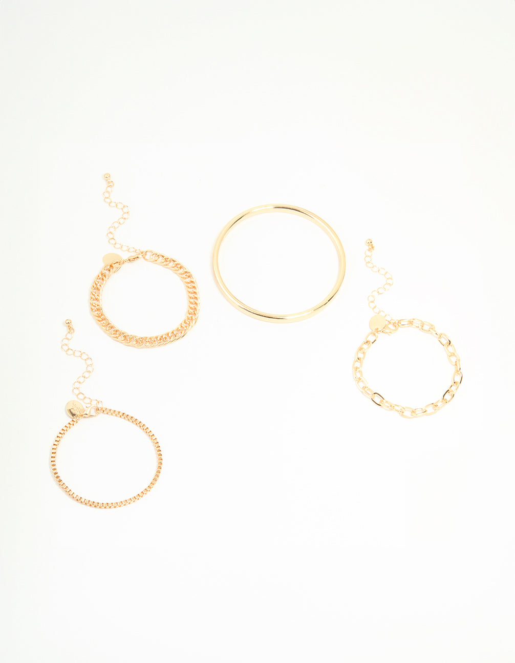 Elevate your accessory game with this Gold Smooth & Chain Bracelets Pack. This stylish wristwear set features a mix of sleek gold-plated designs, from smooth minimalist bands to chic chain styles, offering endless versatility. Perfect for layering or wearing individually, these bracelets bring a touch of elegance to any outfit. Whether you're dressing up for a night out or adding a bit of sparkle to your daytime look, they pair beautifully with dresses, jeans, or even tailored suits. Ideal for casual outings, dinner dates, or parties, these bracelets are your go-to for effortless style. Sophisticated yet playful, they're an essential for every jewellery lover.