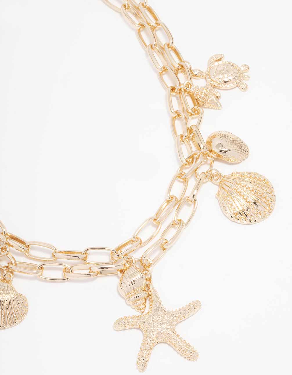 Style this Gold Starfish and Turtle Layered Necklace for a seaside inspired finish to your outfit.