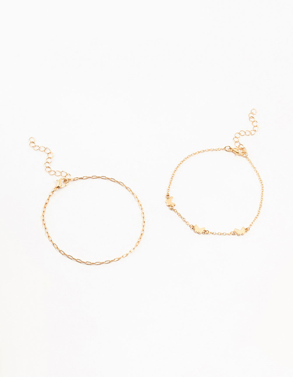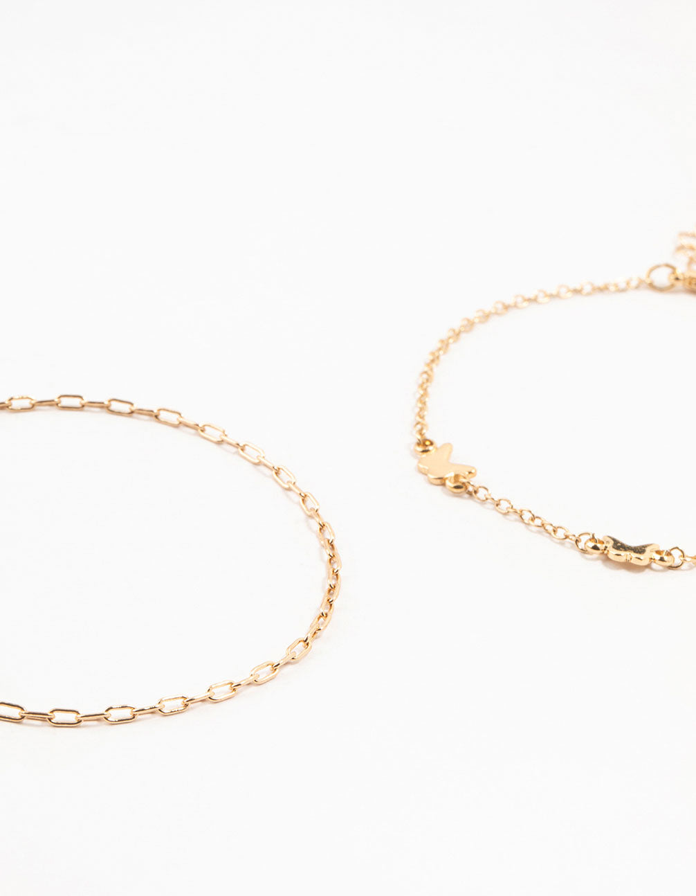 Upgrade your ankle glam with this pack of four fabulous anklets. With gold tones, sleek styles, and droplet butterfly motifs, these anklets add enchanting, whimsical edge to your look.